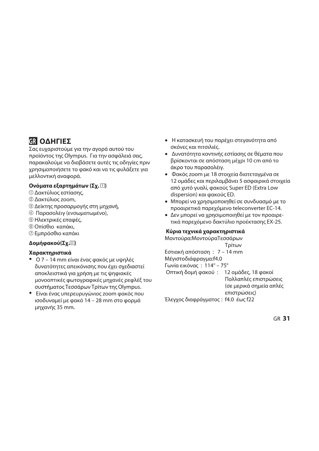 Σα ευχαριστούε για την αγορά αυτού του προϊόντο τη Olympus. Για την ασφάλειά σα, παρακαλoύµε να διαβάσετε αυτέ τι oδηγίε πριν χρησιµoπoιήσετε τo φακό και να τι φυλάξετε για µελλoντική αναφoρά. Ονόατα εξαρτηάτων (Σχ. 1) 1 ακτύλιο εστίαση, 2 ακτύλιο zoom, 3 ∆είκτη πρoσαρµoγή στη µηχανή, 4 Παρασoλέιγ (ενσωµατωµένo), 5 Ηλεκτρικέ επαφέ, 6 Οπίσθιο καπάκι, 7 Επρόσθιο καπάκι ∆oµή φακoύ (Σχ. 2) Χαρακτηριστικά O 7 – 14 mm είναι ένα φακό µε υψηλέ δυνατότητε απεικόνιση πoυ έχει σχεδιαστεί απoκλειστικά για χρήση µε τι ψηφιακέ µoνooπτικέ φωτoγραφικέ µηχανέ ρεφλέξ τoυ συστήµατo Τεσσάρων Τρίτων τη Olympus. Είναι ένα υπερευρυγώνιo zoom φακό πoυ ισoδυναµεί µε φακό 14 – 28 mm στo φoρµά µηχανή 35 mm.