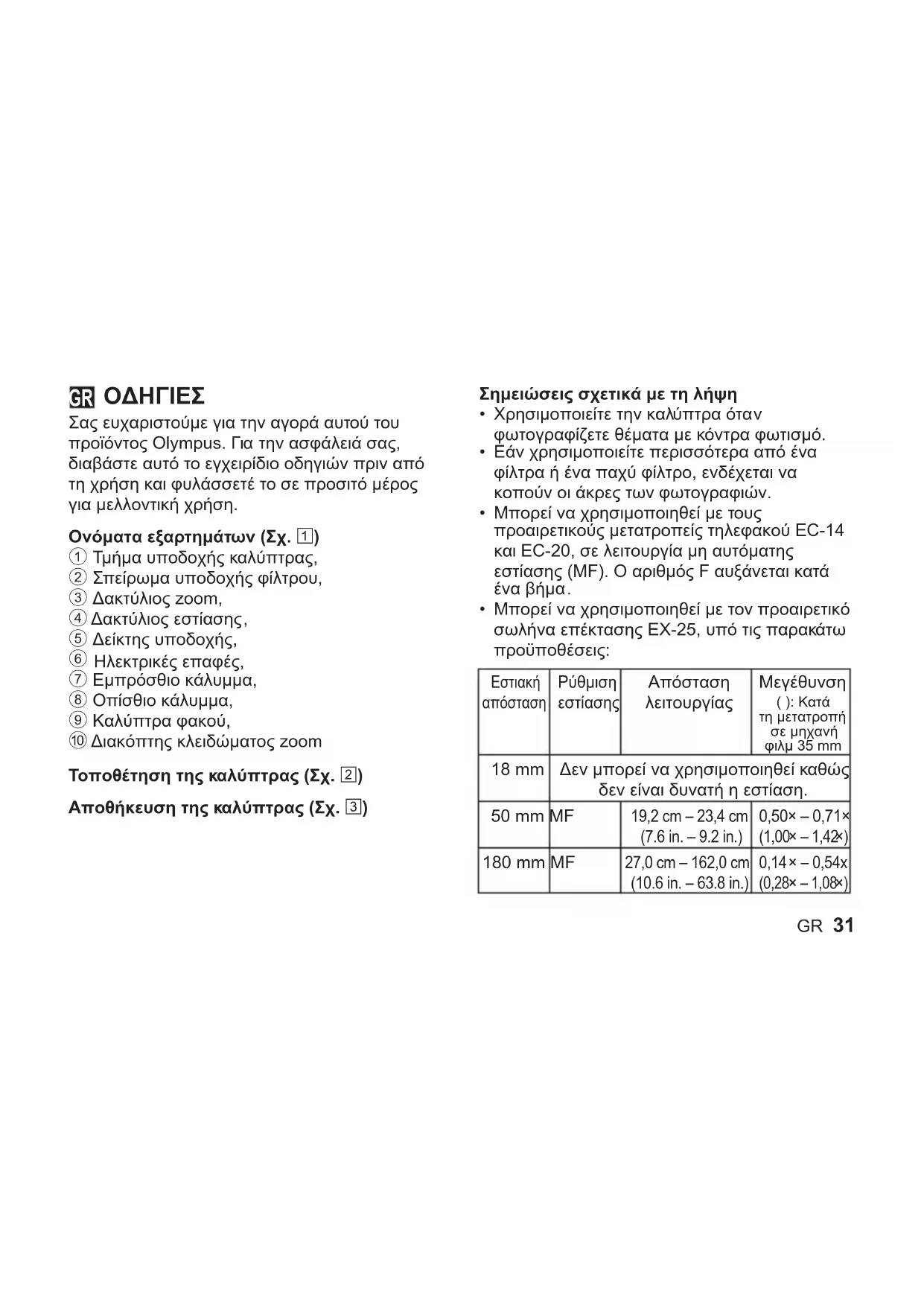 L1002_gr_cs2e.indd 31L1002_gr_cs2e.indd 31 8/25/2008 1:52:31 PM8/25/2008 1:52:31 PM32 GR Δεν είναι δυνατή η χρήση του δακτυλιοειδούς φλας RF-11 και του διπλού φλας TF-22. Βασικά τεχνικά χαρακτηριστικά Υποδοχή : Υποδοχή Four Thirds Εστιακή απόσταση : 18 – 180 mm Μέγ. διάφραγμα : f3,5 – 6,3 Γωνία εικόνας : 62° – 6,9° Στοιχεία φακού : 13 ομάδες, 15 φακοί Επίστρωση πολλαπλών στρωμάτων (μερικώς ενός