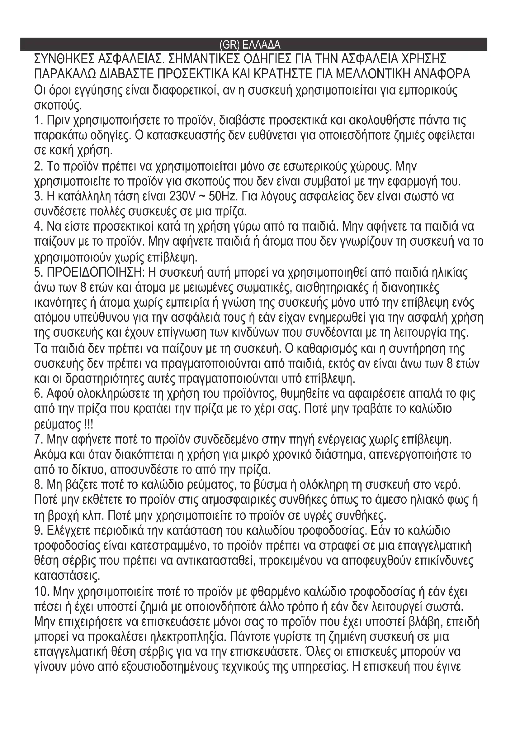 Опис на проблем: Моторот се прегрее. Решение за проблеми: Чекате ладење на моторот над 30 минути и повторно стартувајте. Технички податоци: Влезен напон: 220-240 V ~ 50/60 Hz Номинална моќност: 200 W Максимална моќност: 300 W Максимално работно време: 4 x 25 секунди(GR) ΕΛΛΑΔΑ ΣΥΝΘΗΚΕΣ ΑΣΦΑΛΕΙΑΣ. ΣΗΜΑΝΤΙΚΕΣ ΟΔΗΓΙΕΣ ΓΙΑ ΤΗΝ ΑΣΦΑΛΕΙΑ ΧΡΗΣΗΣ ΠΑΡΑΚΑΛΩ ΔΙΑΒΑΣΤΕ ΠΡΟΣΕΚΤΙΚΑ ΚΑΙ ΚΡΑΤΗΣΤΕ ΓΙΑ ΜΕΛΛΟΝΤΙΚΗ ΑΝΑΦΟΡΑ Οι όροι εγγύησης είναι διαφορετικοί, αν η συσκευή χρησιμοποιείται για εμπορικούς