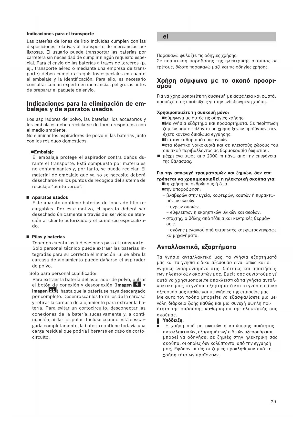 Η συσκευασία προστατεύει την ηλεκτρική σκούπα από ζημιά κατά τη μεταφορά. Αποτελείται από φιλι- κά προς το περιβάλλον υλικά και γι' αυτό είναι ανα- κυκλώσιμη. Παραδώστε τα υλικά συσκευασίας που δε χρειάζονται άλλο, στα σημεία συγκέντρωσης των υλικών ανακύκλωσης. Παλιά συσκευή Αυτή η συσκευή περιλαμβάνει επαναφορτιζόμενες μπαταρίες ιόντων λιθίου. Γι’ αυτό η απόσυρση της συσκευή επιτρέπεται μόνο μέσω των εξουσιοδοτη- μένων κέντρων εξυπηρέτησης πελατών και των ειδι- κών καταστημάτων. Επαναφορτιζόμενες μπαταρίες / μπαταρίες Προσέξτε παρακαλώ τις υποδείξεις για τη μεταφο-