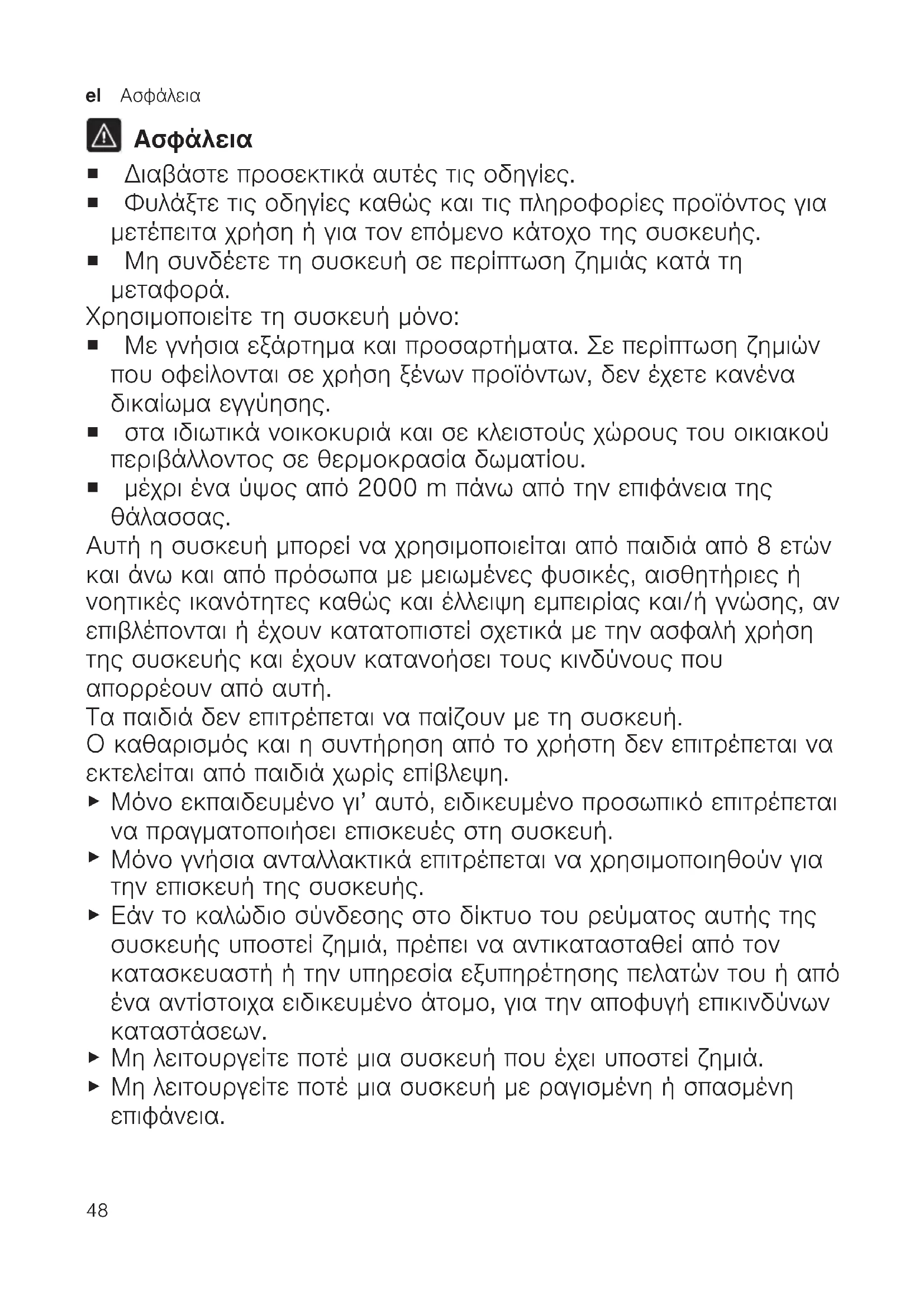 Χρησιμοποιείτε τη συσκευή μόνο: ¡ Με γνήσια εξάρτημα και προσαρτήματα. Σε περίπτωση ζημιών που οφείλονται σε χρήση ξένων προϊόντων, δεν έχετε κανένα δικαίωμα εγγύησης. ¡ στα ιδιωτικά νοικοκυριά και σε κλειστούς χώρους του οικιακού περιβάλλοντος σε θερμοκρασία δωματίου. ¡ μέχρι ένα ύψος από 2000 m πάνω από την επιφάνεια της