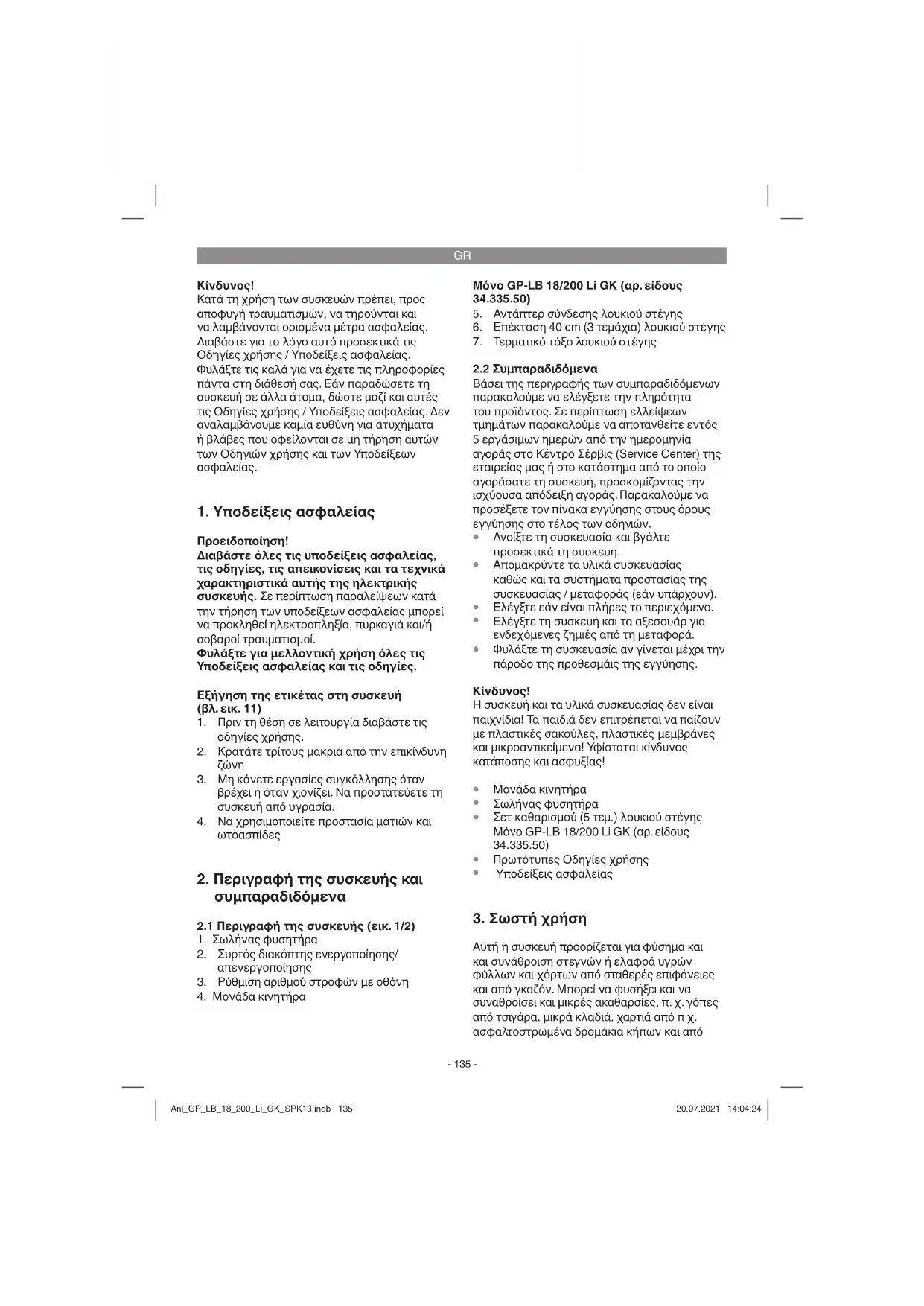 Υπολειπόμενοι κίνδυνοι Aκόμη και σε περίπτωση σωστής και κανονικής χρήσης αυτού του ηλεκτρικού εργαλείου, υφίστανται πάντα ορισμένοι υπολειπόμενοι κίνδυνοι. Oι ακόλουθοι κίνδυνοι μπορούν να παρουσιαστούν ανάλογα με το είδος κατασκευής και το μεντέλο αυτού του ηλεκτρικού εργαλείου: Anl_GP_LB_18_200_Li_GK_SPK13.indb 136Anl_GP_LB_18_200_Li_GK_SPK13.indb 136 20.07.2021 14:04:2420.07.2021 14:04:24GR