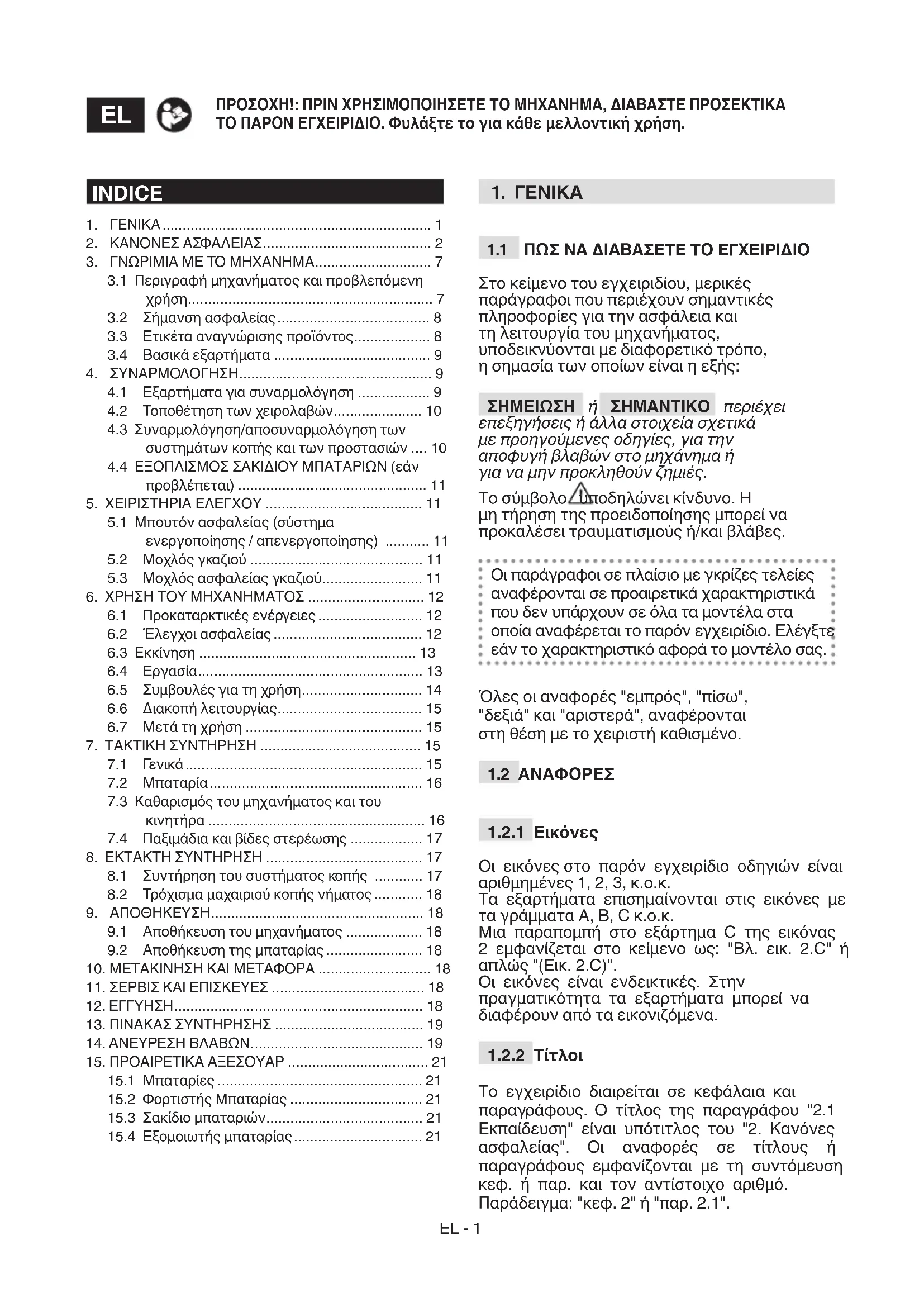 ΣΥΣΤΗΜΑΤΟΣ ΚΟΠΗΣ Κατά τις επεμβάσεις στο σύστημα κοπής, δώστε προσοχή στην πιθανότητα κίνησης του συστήματος κοπής, ακόμα και αν η μπαταρία έχει αφαιρεθεί από τη θήκη της. Σε αυτό το μηχάνημα προβλέπεται η χρήση συστημάτων κοπής που φέρουν τον υποδεικνυόμενο κωδικό στον πίνακα Τεχνικά Χαρακτηριστικά. Λόγω της εξέλιξης του προϊόντος, τα συστήματα κοπής που αναφέρονται στον πίνακα "Τεχνικά Χαρακτηριστικά" μπορεί με την πάροδο του χρόνου να αντικατασταθούν από διαφορετικά συστήματα με ανάλογα χαρακτηριστικά ανταλλαξιμότητας και ασφάλειας στη λειτουργία. Μην αγγίζετε το σύστημα κοπής μέχρι να αφαιρέσετε την μπαταρία και μέχρι την πλήρη ακινητοποίησή του. Προσοχή! Κίνδυνος τραυματισμού λόγω επικίνδυνων εξαρτημάτων σε κίνησης!