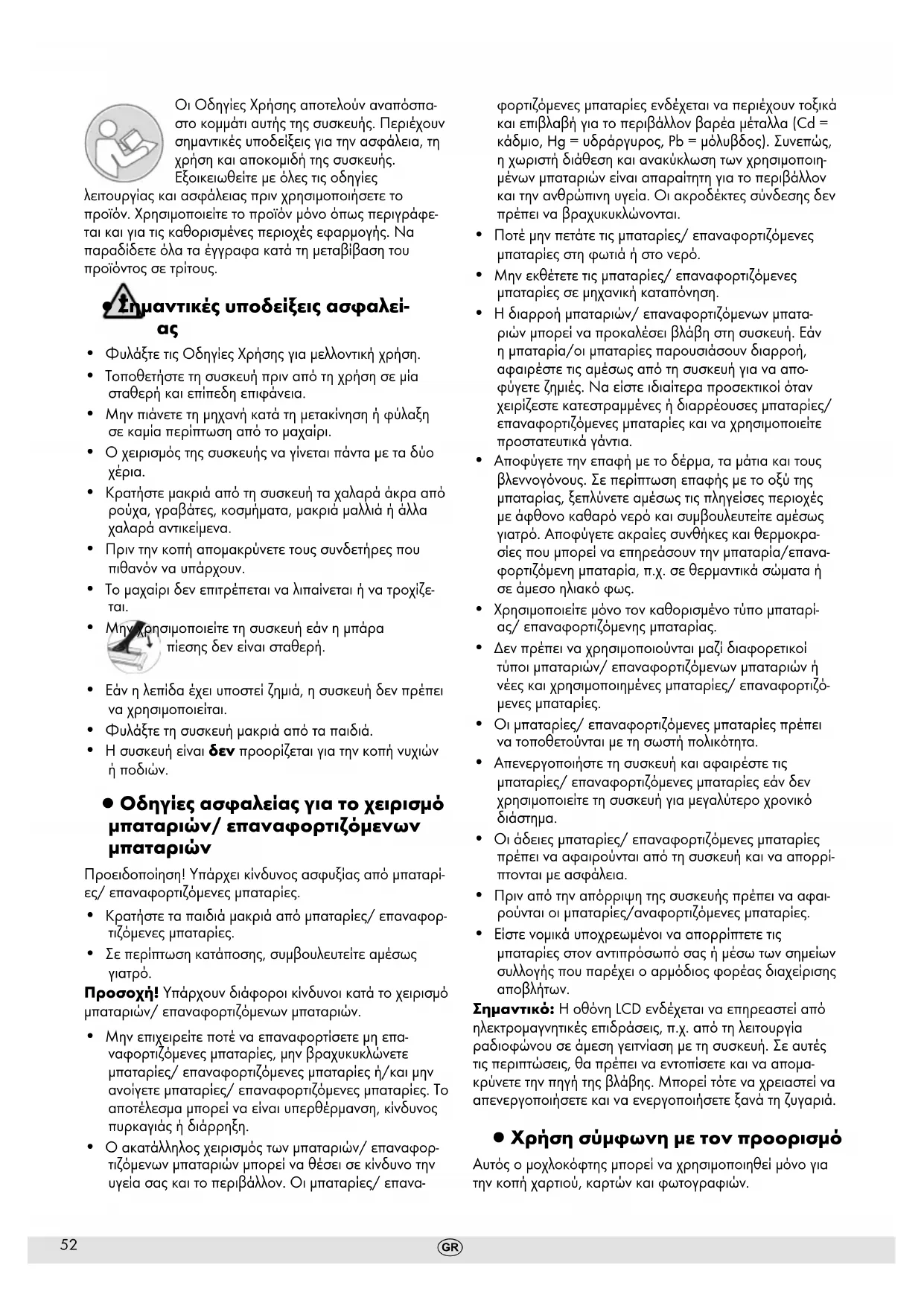 ▯ Οδηγίες ασφαλείας για το χειρισμό μπαταριών/ επαναφορτιζόμενων
