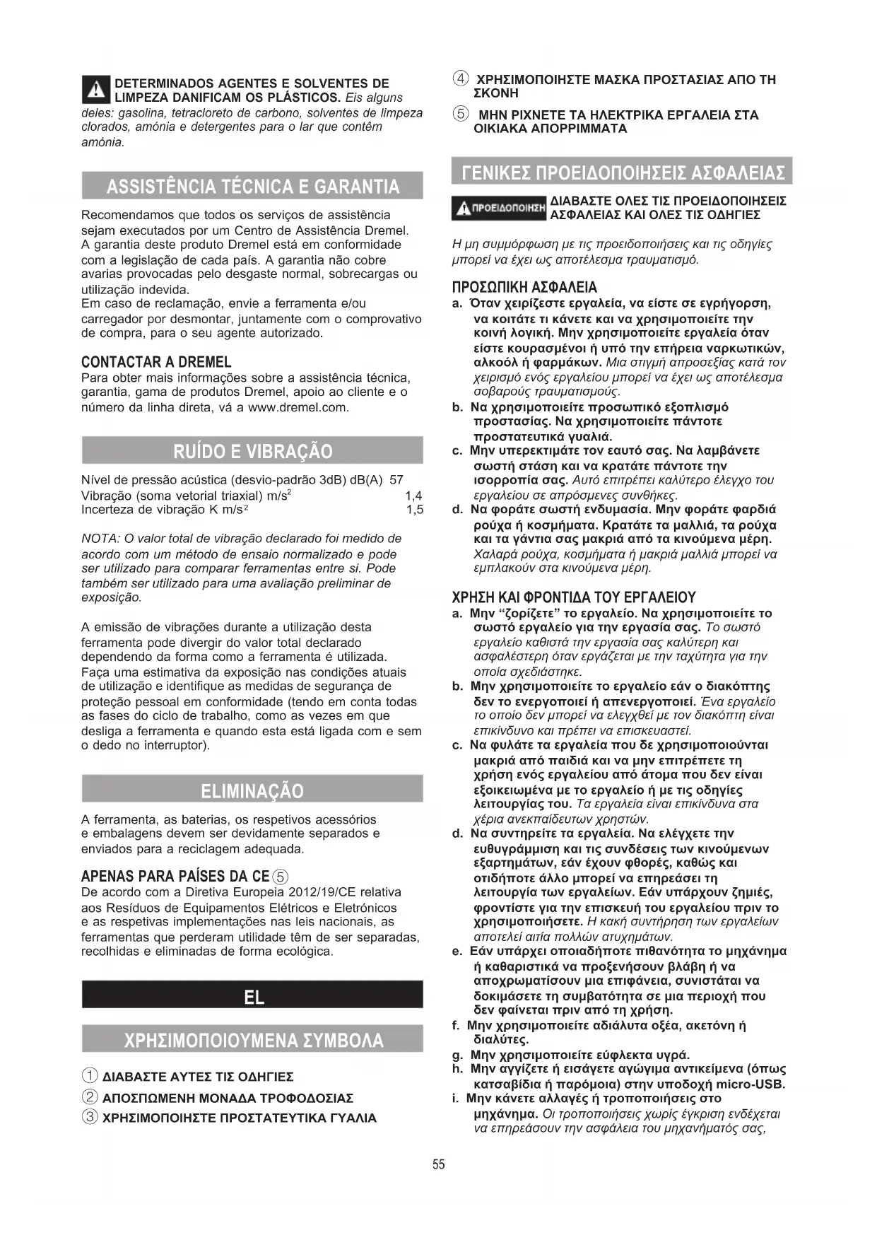 ΟΡΙΣΜΕΝΑ ΥΛΙΚΑ ΚΑΘΑΡΙΣΜΟΥ ΚΑΙ ΔΙΑΛΥΤΕΣ ΠΡΟΚΑΛΟΥΝ ΖΗΜΙΕΣ ΣΤΑ ΠΛΑΣΤΙΚΑ ΜΕΡΗ. Ορισμένα από αυτά είναι: βενζίνη, τετραχλωράνθρακας, χλωριωμένα διαλύματα καθαρισμού, αμμωνία και υγρά καθαρισμού οικιακής χρήσης που περιέχουν αμμωνία. ΣΕΡΒΙΣ ΚΑΙ ΕΓΓΥΗΣΗ Για οποιαδήποτε εργασία συντήρησης ή επισκευής των εργαλείων, σας συνιστούμε να απευθύνεστε σε ένα Κέντρο Επισκευών Dremel. Αυτό το προϊόν Dremel είναι εγγυημένο σύμφωνα με τη νομοθεσία και τους κανονισμούς της συγκεκριμένης χώρας. Οι βλάβες που οφείλονται σε φυσιολογική φθορά, υπερφόρτωση ή εσφαλμένο χειρισμό δεν καλύπτονται από την εγγύηση. Σε περίπτωση προβλήματος, στείλτε το εργαλείο ή/ και τον φορτιστή στον προμηθευτή σας, χωρίς να τα αποσυναρμολογήσετε, μαζί με το παραστατικό αγοράς. ΕΠΑΦΗ ME ΤΗΝ DREMEL Για περισσότερες πληροφορίες σχετικά με την επισκευή και την εγγύηση του προϊόντος, για τη σειρά προϊόντων Dremel, καθώς και για υπηρεσίες υποστήριξης και την τηλεφωνική γραμμή άμεσης εξυπηρέτησης, ανατρέξτε στην ιστοσελίδα www.dremel.com. ΘΟΡΥΒΟΣ ΚΑΙ ΚΡΑΔΑΣΜΟΙ Στάθμη ηχητικής πίεσης (τυπική απόκλιση 3dB) dB(A) 57 Κραδασμοί (άθροισμα ανυσμάτων τριών αξόνων) m/s