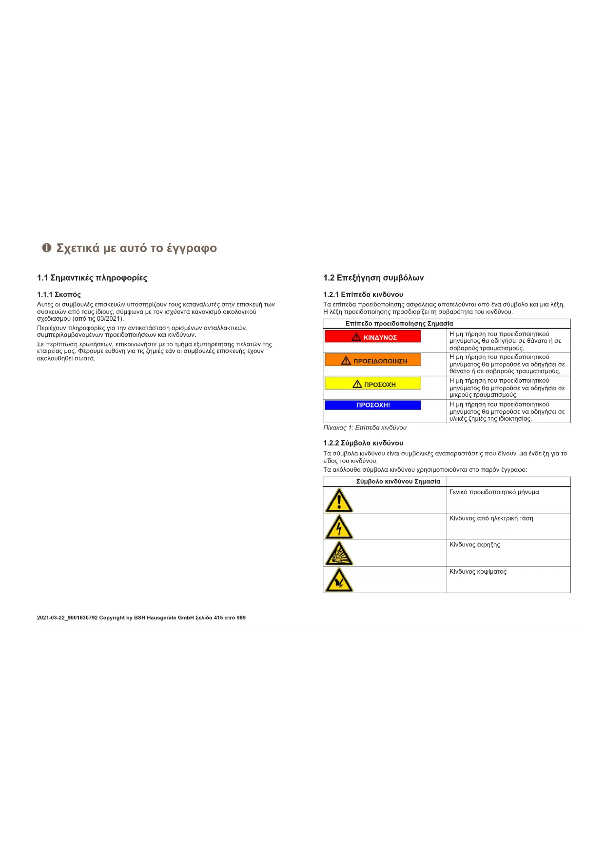 Τα σύμβολα κινδύνου είναι συμβολικές αναπαραστάσεις που δίνουν μια ένδειξη για το είδος του κινδύνου. Τα ακόλουθα σύμβολα κινδύνου χρησιμοποιούνται στο παρόν έγγραφο: Σύμβολο κινδύνου Σημασία Γενικό προειδοποιητικό μήνυμα Κίνδυνος από ηλεκτρική τάση Κίνδυνος έκρηξης Κίνδυνος κοψίματος Σχετικά με αυτό το έγγραφο 2021-03-22_9001630792 Copyright by BSH Hausgeräte GmbH Σελίδα415από989Σύμβολο κινδύνου Σημασία Κίνδυνος σύνθλιψης Κίνδυνος από καυτές επιφάνειες Κίνδυνος από ισχυρό μαγνητικό πεδίο Κίνδυνος από μη ιονίζουσα ακτινοβολία Πίνακας2: Σύμβολα κινδύνου
