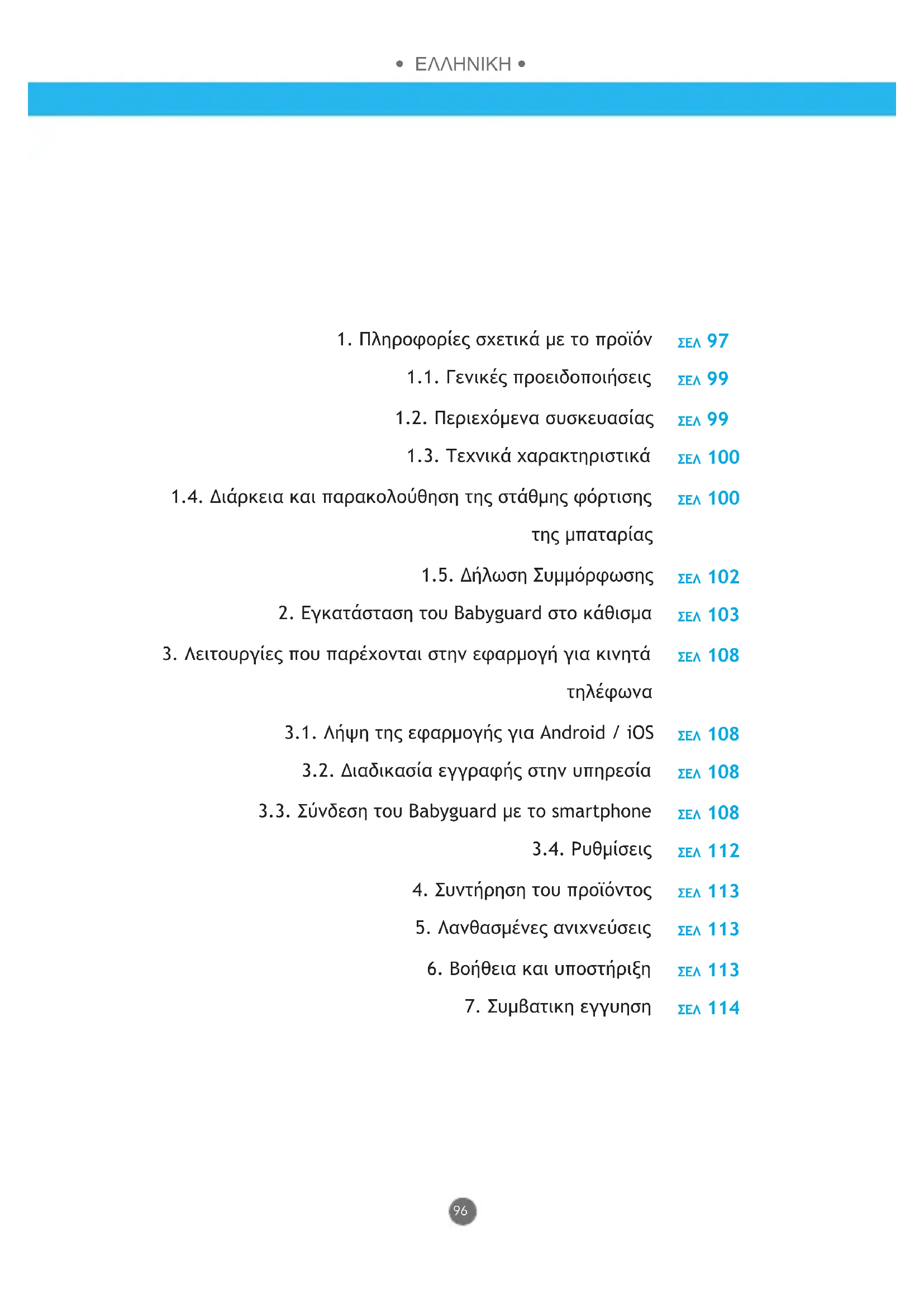 1.1. Γενικές προειδοποιήσεις 1.2. Περιεχόμενα συσκευασίας 1.3. Τεχνικά χαρακτηριστικά 1.4. Διάρκεια και παρακολούθηση της στάθμης φόρτισης της μπαταρίας 1.5. Δήλωση Συμμόρφωσης