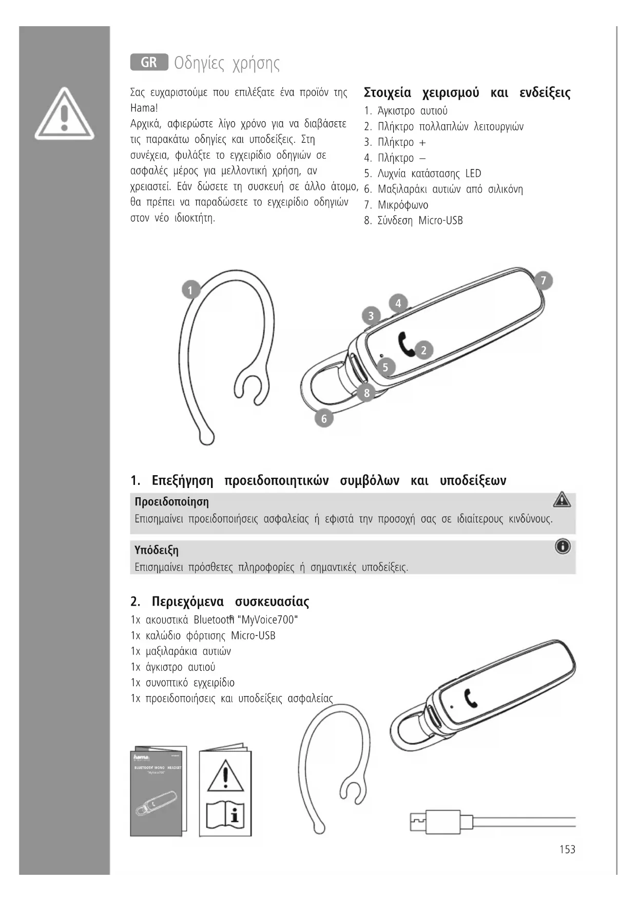С настоящото Hama GmbH & Co KG декларира, че типът на радиооборудването [00184069] съответства на Директива 2014/53/ЕС Пълният текст на ЕС декларацията за съответствие е на разположение на следния интернет адрес: wwwhamacom->00184069-> Downloads Честотна лента/честотни ленти 2402MHz – 2480MHz Максимална излъчвателна мощност 4dBm153 J Οδηγίες χρήσης Σας ευχαριστούμε που επιλέξατε ένα προϊόν της Hama! Αρχικά, αφιερώστε λίγο χρόνο για να διαβάσετε τις παρακάτω οδηγίες και υποδείξεις Στη συνέχεια, φυλάξτε το εγχειρίδιο οδηγιών σε ασφαλές μέρος για μελλοντική χρήση, αν χρειαστεί Εάν δώσετε τη συσκευή σε άλλο άτομο, θα πρέπει να παραδώσετε το εγχειρίδιο οδηγιών στον νέο ιδιοκτήτη Στοιχεία χειρισμού και ενδείξεις 1 Άγκιστρο αυτιού 2 Πλήκτρο πολλαπλών λειτουργιών 3 Πλήκτρο + 4 Πλήκτρο − 5 Λυχνία κατάστασης LED 6 Μαξιλαράκι αυτιών από σιλικόνη 7 Μικρόφωνο 8 Σύνδεση Micro-USB