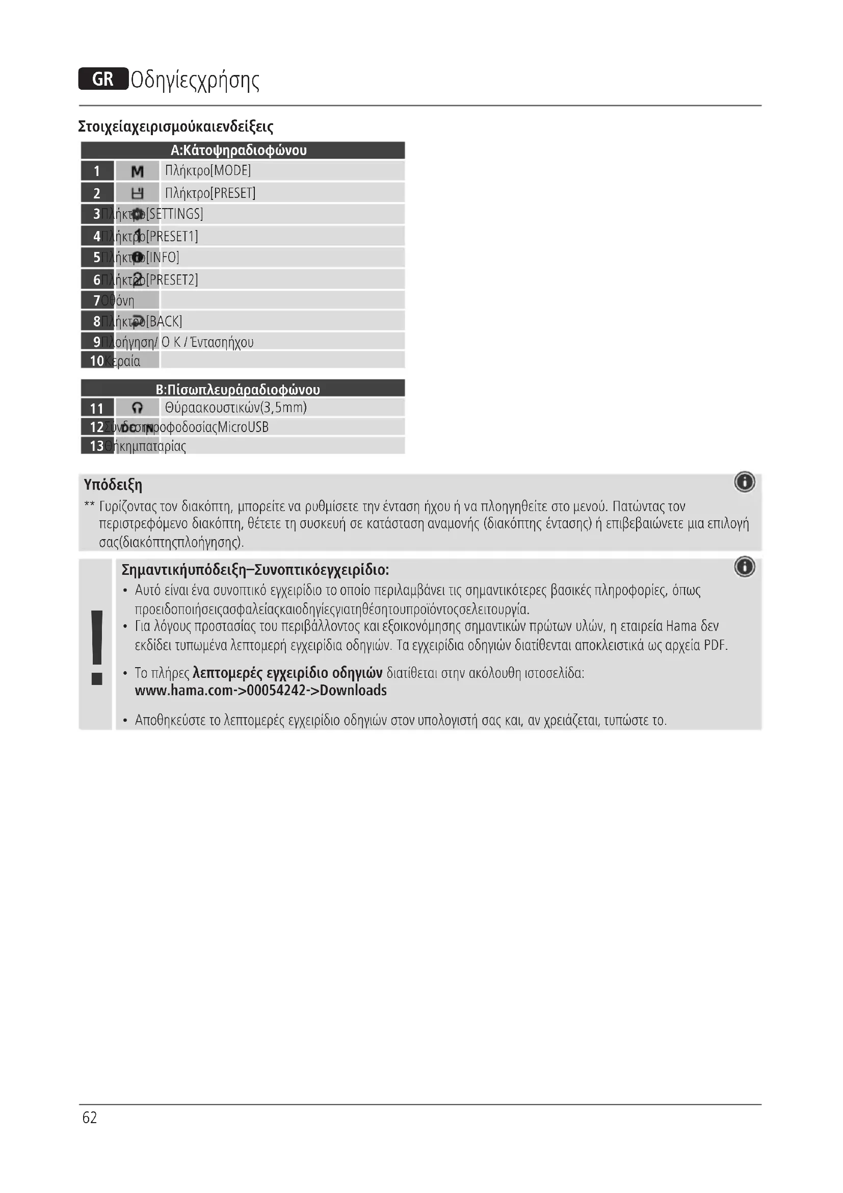 - Το πλήρες λεπτομερές εγχειρίδιο οδηγιών διατίθεται στην ακόλουθη ιστοσελίδα: www.hama.com -> 00054242 -> Downloads