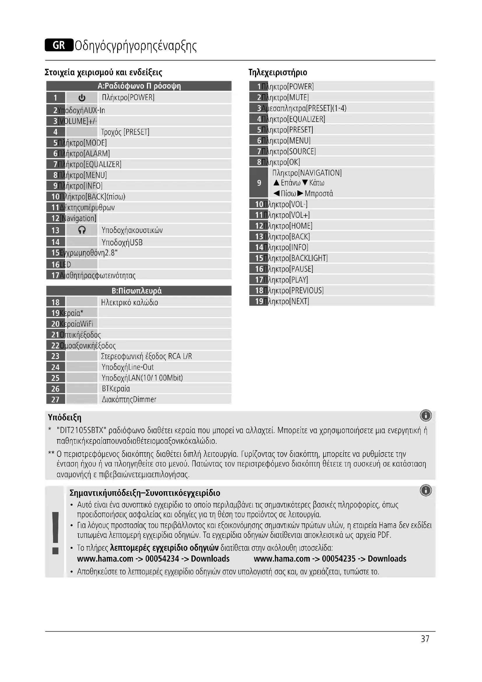 - Για λόγους προστασίας τουπεριβάλλοντος και εξοικονόμησηςσημαντικώνπρώτωνυλών, ηεταιρεία Hama δεν εκδίδει τυπωμένα λεπτομερή εγχειρίδιαοδηγιών. Τα εγχειρίδιαοδηγιώνδιατίθενται αποκλειστικά ως αρχεία PDF.
