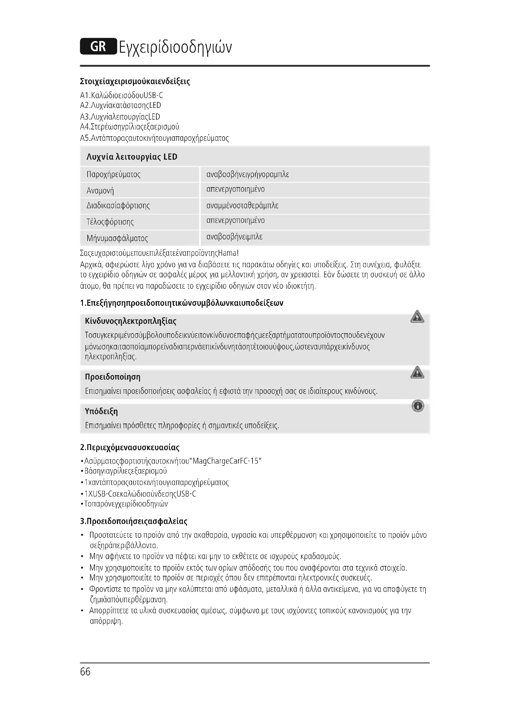 απενεργοποιημένο Διαδικασία φόρτισης αναμμένο σταθερά μπλε Τέλος φόρτισης απενεργοποιημένο Μήνυμα σφάλματος αναβοσβήνει μπλε Σας ευχαριστούμε που επιλέξατε ένα προϊόν της Hama! Αρχικά, αφιερώστε λίγο χρόνο για να διαβάσετε τις παρακάτω οδηγίες και υποδείξεις. Στη συνέχεια, φυλάξτε το εγχειρίδιο οδηγιών σε ασφαλές μέρος για μελλοντική χρήση, αν χρειαστεί. Εάν δώσετε τη συσκευή σε άλλο άτομο, θα πρέπει να παραδώσετε το εγχειρίδιο οδηγιών στον νέο ιδιοκτήτη.