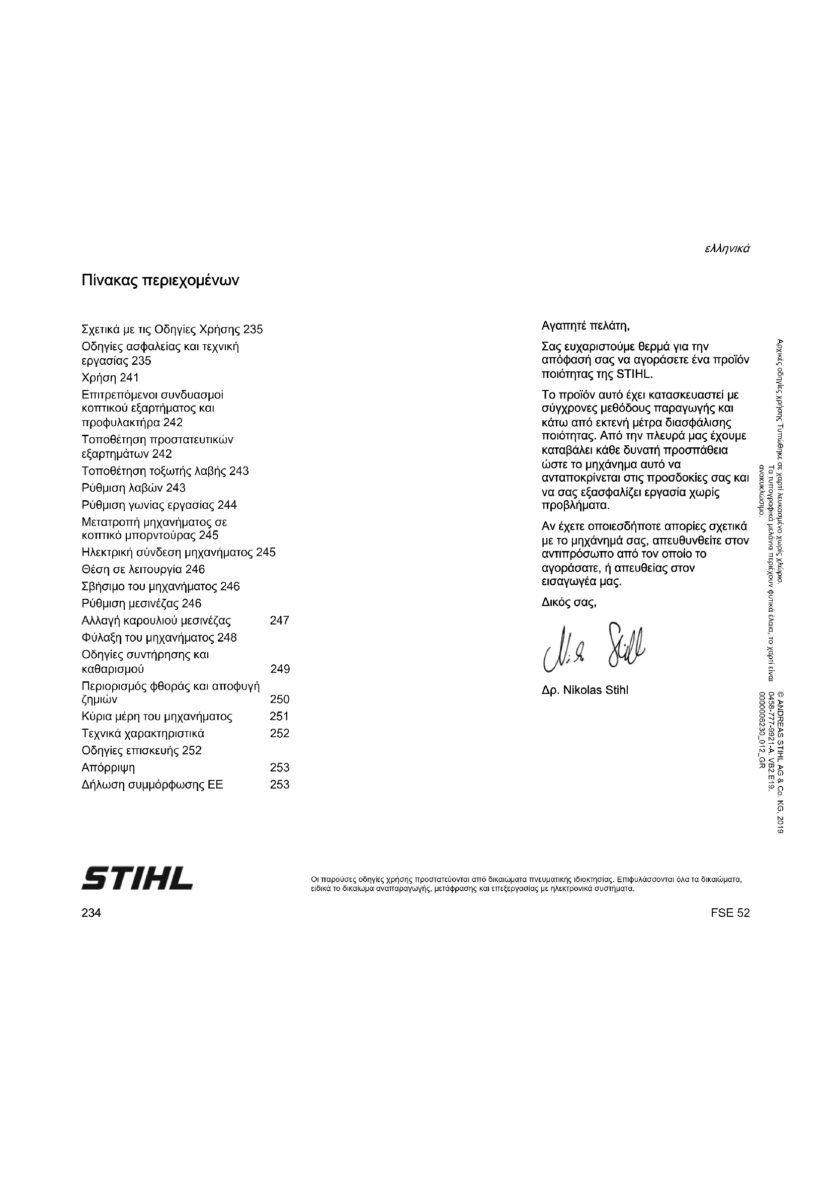 Δρ. Nikolas Stihl Σχετικά με τις Οδηγίες Χρήσης 235 Οδηγίες ασφαλείας και τεχνική εργασίας 235 Χρήση 241 Επιτρεπόμενοι συνδυασμοί κοπτικού εξαρτήματος και προφυλακτήρα 242 Τοποθέτηση προστατευτικών εξαρτημάτων 242 Τοποθέτηση τοξωτής λαβής 243 Ρύθμιση λαβών 243 Ρύθμιση γωνίας εργασίας 244 Μετατροπή μηχανήματος σε κοπτικό μπορντούρας 245 Ηλεκτρική σύνδεση μηχανήματος 245 Θέση σε λειτουργία 246 Σβήσιμο του μηχανήματος 246 Ρύθμιση μεσινέζας 246 Αλλαγή καρουλιού μεσινέζας 247 Φύλαξη του μηχανήματος 248 Οδηγίες συντήρησης και καθαρισμού 249 Περιορισμός φθοράς και αποφυγή ζημιών 250 Κύρια μέρη του μηχανήματος 251 Τεχνικά χαρακτηριστικά 252 Οδηγίες επισκευής 252 Απόρριψη 253 Δήλωση συμμόρφωσης ΕΕ 253FSE 52
