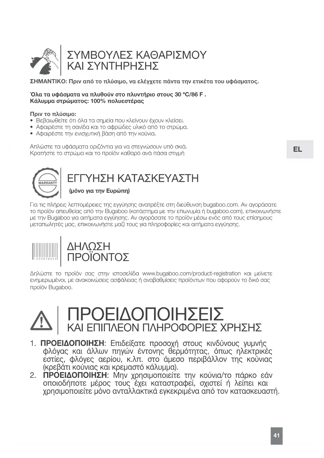 Δηλώστε το προϊόν σας στην ιστοσελίδα www.bugaboo.com/product-registration και μείνετε ενημερωμένοι, με ανακοινώσεις ασφάλειας ή αναβαθμίσεις προϊόντων που αφορούν το δικό σας προϊόν Bugaboo. ΠΡΟΕΙΔΟΠΟΙΗΣΕΙΣ ΚΑΙ ΕΠΙΠΛΕΟΝ ΠΛΗΡΟΦΟΡΙΕΣ ΧΡΗΣΗΣ