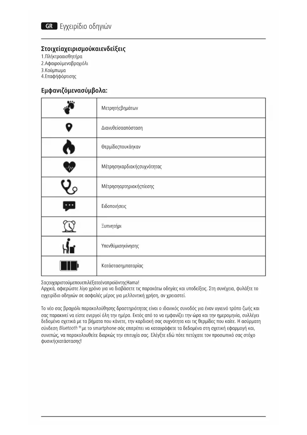 Υπενθύμιση κίνησης Κατάσταση μπαταρίας Σας ευχαριστούμε που επιλέξατε ένα προϊόν της Hama! Αρχικά, αφιερώστε λίγο χρόνο για να διαβάσετε τις παρακάτω οδηγίες και υποδείξεις. Στη συνέχεια, φυλάξτε το εγχειρίδιο οδηγιών σε ασφαλές μέρος για μελλοντική χρήση, αν χρειαστεί. Το νέο σας βραχιόλι παρακολούθησης δραστηριότητας είναι οιδανικός συνοδός για έναν υγιεινό τρόπο ζωής και σας παρακινεί να είστε ενεργοί όλη την ημέρα. Εκτός από το να εμφανίζει την ώρα και την ημερομηνία, συλλέγει δεδομένα σχετικά με τα βήματα που κάνετε, την καρδιακή σας συχνότητα και τις θερμίδες που καίτε. Ηασύρματη