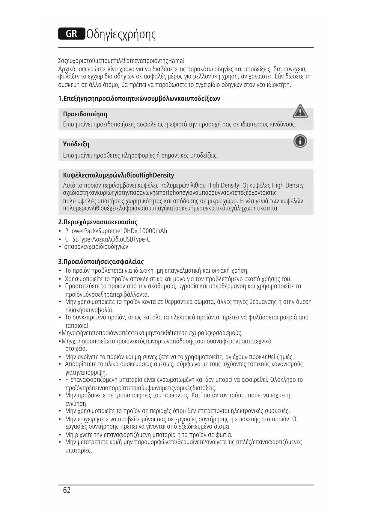 Υπόδειξη σχετικά με την προστασία περιβάλλοντος: Από τη στιγμή που οι Ευρωπαϊκές Οδηγίες 2012/19/ΕΕ και 2006/66/ΕΚ ενσωματώνονται στην κρατική νομοθεσία, ισχύουν τα εξής: Οι ηλεκτρικές και ηλεκτρονικές συσκευές καθώς και οι μπαταρίες δεν επιτρέπεται να απορρίπτονται στα οικιακά απορρίμματα. Οι καταναλωτές υποχρεούνται από τον νόμο να επιστρέφουν τις ηλεκτρικές και ηλεκτρονικές συσκευές καθώς και τις μπαταρίες που έχουν φτάσει στο τέλος του κύκλου της ζωής τους στα δημόσια σημεία περισυλλογής που έχουν δημιουργηθεί γι’ αυτόν τον σκοπό ήστα σημεία πώλησης. Οι λεπτομέρειες ρυθμίζονται στην εκάστοτε κρατική νομοθεσία. Το σύμβολο πάνω στο προϊόν, στο εγχειρίδιο χρήσης ή στη συσκευασία παραπέμπει σε αυτές τις διατάξεις. Με την ανακύκλωση, την επαναχρησιμοποίηση των υλικών ήμεάλλες μορφές αξιοποίησης παλιών συσκευών / μπαταριών συνεισφέρετε σημαντικά στην προστασία του περιβάλλοντος.66 Bir Hama ürününü tercih ettiğiniz için çok teşekkür ederiz! Biraz zaman ayırıpaşağıdaki talimat ve açıklamaları tamamen okuyun. Gerektiğinde tekrar başvurmak için bu kullanımkılavuzunu daha sonragüvenli bir yerde muhafaza edin. Cihazı devretmeniz durumunda bu kullanımkılavuzunu da ürünün yeni sahibine teslim edin.