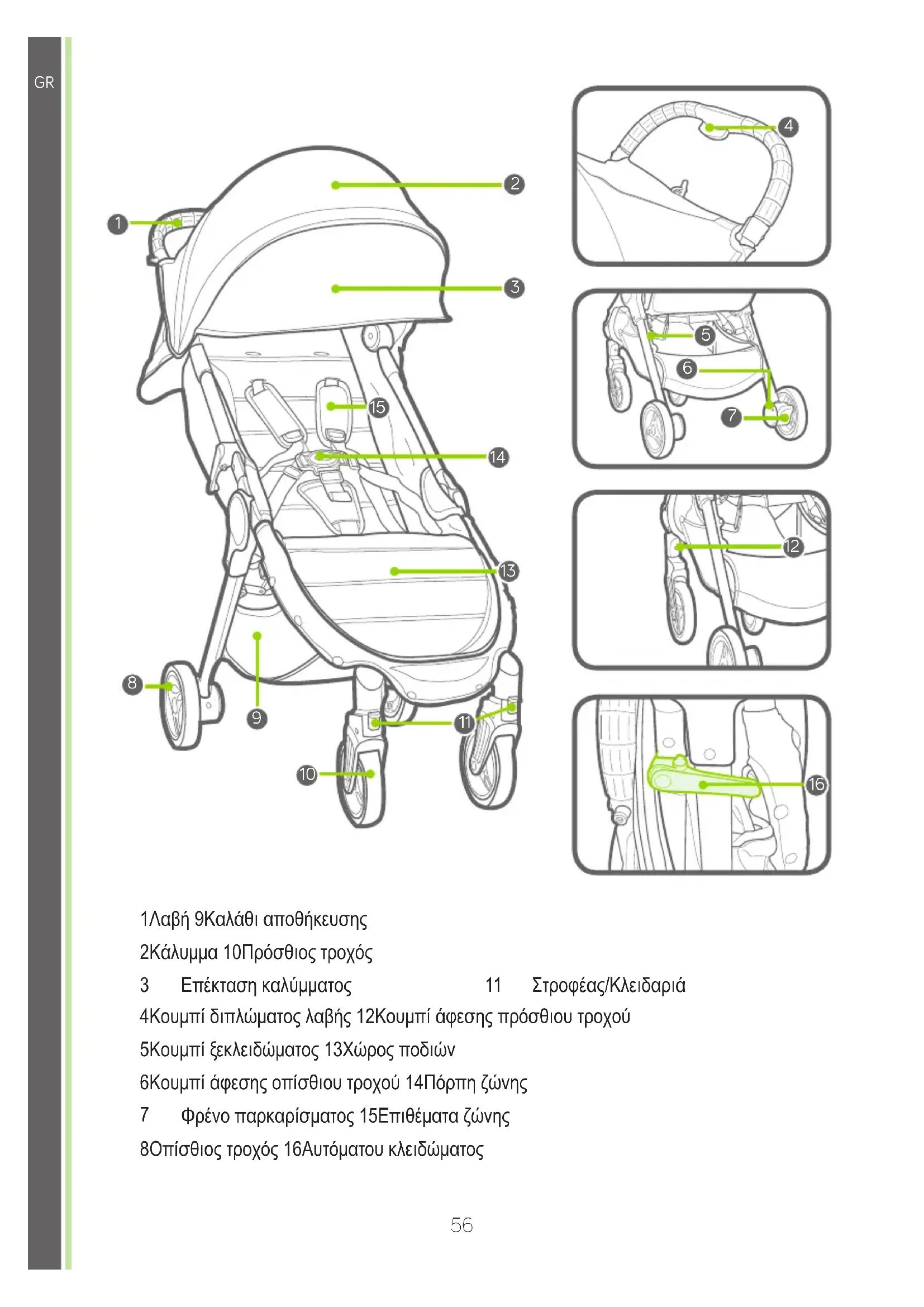 1 Λαβή 9 Καλάθι αποθήκευσης 2 Κάλυμμα 10 Πρόσθιος τροχός 3 Επέκταση καλύμματος 11 Στροφέας/Κλειδαριά 4 Κουμπί διπλώματος λαβής 12 Κουμπί άφεσης πρόσθιου τροχού 5 Κουμπί ξεκλειδώματος 13 Χώρος ποδιών 6 Κουμπί άφεσης οπίσθιου τροχού 14 Πόρπη ζώνης