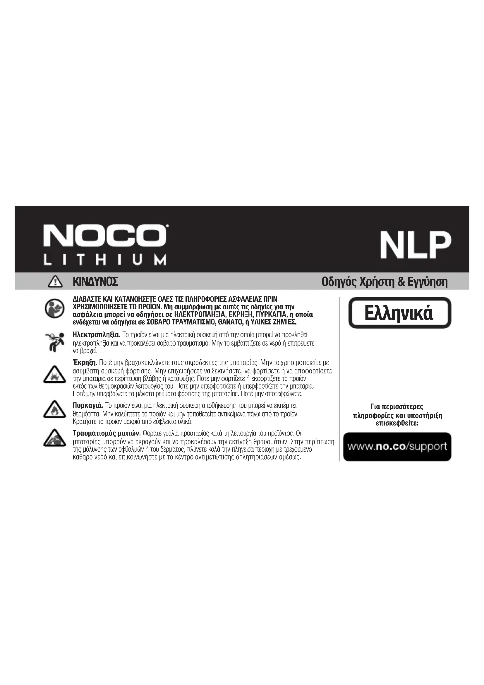 ΕλληνικάΠρόταση 65. Οι συστοιχίες, οι πόλοι των μπαταριών και τα σχετικά παρελκόμενα περιέχουν χημικά. Είναι γνωστό στην Πολιτεία της Καλιφόρνια ότι αυτά τα υλικά προκαλούν καρκίνο και άλλες συγγενείς αναπηρίες και άλλες βλάβες στο αναπαραγωγικό σύστημα. Προσωπική Προφύλαξη. Χρησιμοποιήστε αυτό το προϊόν μόνο για την ενδεικνυόμενη χρήση του. Σε περίπτωση έκτακτης ανάγκης, να έχετε κάποιο άλλο άτομο δίπλα σας κατά τη διάρκεια της χρήσης αυτού του προϊόντος. Να φοράτε πλήρη προστατευτικό εξοπλισμό για τα μάτια και προστατευτικό ρουχισμό όταν εργάζεστε κοντά σε μπαταρίες. Να πλένετε πάντοτε τα χέρια σας μετά από τον χειρισμό των μπαταριών και των σχετικών υλικών. Μην χειρίζεστε και μη φοράτε οποιαδήποτε άλλα μεταλλικά αντικείμενα όταν εργάζεστε με μπαταρίες, συμπεριλαμβανομένων των εξής: εργαλείων, ρολογιών ή κοσμημάτων. Εάν πέσει μέταλλο πάνω στην μπαταρία, μπορεί να προκληθούν σπινθήρες ή να προκληθεί βραχυκύκλωμα, κάτι που μπορεί να έχει ως αποτέλεσμα ηλεκτροσόκ, φωτιά, έκρηξη και να προκληθεί τραυματισμός, θάνατος ή φθορά περιουσίας. Ανήλικοι. Εάν αυτό το προϊόν αγοράστηκε με σκοπό τη χρήση από ανήλικο από τον "Αγοραστή", ο ενήλικος αγοραστής συμφωνεί να παρέχει λεπτομερείς οδηγίες και προειδοποιήσεις σε οποιονδήποτε ανήλικο πριν από τη χρήση. Ο "Αγοραστής" συμφωνεί να καλύψει τη NOCO έναντι οποιασδήποτε μη ενδεικνυόμενης ή λανθασμένης χρήσης από ανήλικο. Κίνδυνος Πνιγμού. Τα αξεσουάρ για το προϊόν ενδέχεται να ενέχουν κίνδυνο πνιγμού για παιδιά. Μην αφήνετε τα παιδιά χωρίς επίβλεψη με το προϊόν ή οποιοδήποτε από τα αξεσουάρ. Αυτό το προϊόν δεν είναι παιχνίδι. Χειρισμός. Να χειρίζεστε το προϊόν με προσοχή. Μπορεί να προκληθούν βλάβες στο προϊόν εάν αυτό χτυπηθεί. Μην χρησιμοποιείτε το προϊόν εάν αυτό έχει υποστεί φθορές, συμπεριλαμβανομένων, μεταξύ άλλων, σπασιμάτων στο περίβλημα. Η υγρασία και τα υγρά μπορεί να προκαλέσουν βλάβες στο προϊόν. Μην χειρίζεστε τα προϊόντα ή οποιονδήποτε άλλο ηλεκτρικό εξοπλισμό κοντά σε οποιοδήποτε υγρό. Αποθηκεύστε το προϊόν σε ξηρό περιβάλλον. Μην χρησιμοποιείτε το προϊόν εάν αυτό βραχεί. Εάν το προϊόν βρίσκεται ήδη σε λειτουργία και βραχεί, διακόψτε αμέσως τη λειτουργία του. Τροποποιήσεις. Μην επιχειρήσετε οποιαδήποτε αλλαγή, τροποποίηση ή επισκευή σε οποιοδήποτε μέρος του προϊόντος. Η αποσυναρμολόγηση του προϊόντος μπορεί να προκαλέσει τραυματισμό, θάνατο ή υλικές ζημιές. Εάν το προϊόν υποστεί βλάβη, φθορές, εάν δεν λειτουργεί σωστά ή εάν έρθει σε επαφή με οποιοδήποτε υγρό, διακόψτε τη χρήση και επικοινωνήστε με τη NOCO. Μην απενεργοποιήσετε ποτέ το εσωτερικό σύστημα διαχείρισης μπαταρίας (BMS) για οποιονδήποτε λόγο. Οποιαδήποτε τροποποίηση στο προϊόν θα ακυρώσει την εγγύησή σας. Λειτουργία. Η εύρος θερμοκρασίας λειτουργίας είναι από -4ºF (-20ºC) έως 140ºF (60ºC). Το εύρος θερμοκρασίας φόρτισης είναι από 14ºF (-10ºC) έως 122ºF (50ºC). Μην το χρησιμοποιείτε εκτός του εύρους των συνιστώμενων θερμοκρασιών. Αποθήκευση. Το συνιστώμενο εύρος θερμοκρασίας για αποθήκευση είναι από -4ºF (-20ºC) έως 140ºF (60ºC). Να μην εκτίθεται σε θερμοκρασίες άνω των 140ºF (60ºC) για οποιονδήποτε λόγο. Για τη μέγιστη διάρκεια ζωής, αποθηκεύστε το στους 77ºF (25ºC) και σε κατάσταση φόρτισης (SOC) μεγαλύτερη από εβδομήντα τοις εκατό (70%). Ο βαθμός αδρανούς αποφόρτισης σε κατάσταση αποθήκευσης είναι μικρότερος από πέντε τοις εκατό (5%) ανά μήνα. Δεν συνι
