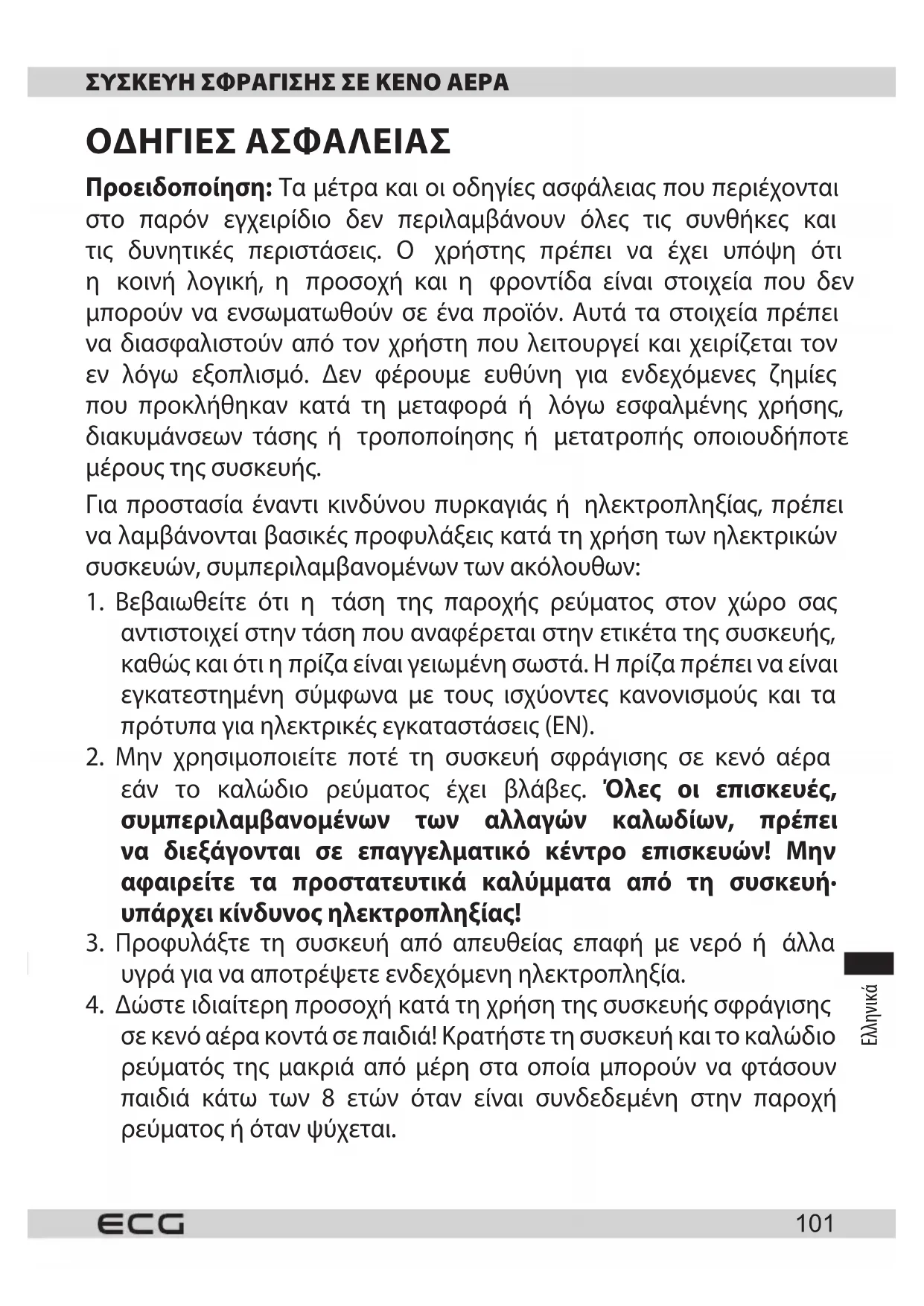 Θερμοκρασία δωματίου (25 ±2°C) Χωρίς κενό αέρα Σακούλες για συσκευές σφράγισης σεκενό αέρα Φρέσκο ψωμί 1-2 ημέρες 8-10 ημέρες Μπισκότα 4-6 μήνες 12 μήνες Μη μαγειρεμένα ζυμαρικά/ρύζι 5-6 μήνες 12 μήνες Αλεύρι 4-6 μήνες 12 μήνες Αποξηραμένα φρούτα 3-4 μήνες 12 μήνες Κόκκοι καφέ 2-3 μήνες 12 μήνες Φύλλα τσαγιού 5-6 μήνες 12 μήνες Λευκό τσάι 1-2 μήνες 12 μήνες Στον καταψύκτη (–18 ±2°C) Χωρίς κενό αέρα Σακούλες για συσκευές σφράγισης σεκενό αέρα Κρέας 4-6 μήνες 15-20 μήνες Ψάρι 3-4 μήνες 10-12 μήνες Λαχανικά 8-10 μήνες 8-24 μήνες ΤΕΧΝΙΚΕΣ ΠΑΡΑΜΕΤΡΟΙ Ονομαστική τάση: 220–240 V~ 50–60 Hz Ονομαστική είσοδος ισχύος: 100 W Χρόνος σφράγισης: 6-10 δευτερόλεπτα Χρόνος συσκευασίας και σφράγισης σε κενό αέρα: 10-20 δευτερόλεπτα ΧΡΗΣΗ ΚΑΙ ΑΠΟΡΡΙΨΗ ΑΠΟΒΛΗΤΏΝ Χαρτί περιτυλίγματος και αυλακωτό χαρτόνι – παραδώστε σε σημείο ανακύκλωσης. Μεμβράνη συσκευασίας, σακούλες PE, πλαστικά στοιχεία – πετάξτε σε κάδους ανακύκλωσης πλαστικών. ΑΠΟΡΡΙΨΗ ΠΡΟΪΟΝΤΏΝ ΣΤΟ ΤΕΛΟΣ ΤΗΣ ΖΏΗΣ ΤΟΥΣ Απόρριψη ηλεκτρικού και ηλεκτρονικού εξοπλισμού (ισχύει σε χώρες μέλη της ΕΕ και άλλες ευρωπαϊκές χώρες που εφαρμόζουν σύστημα ανακύκλωσης) Το απεικονιζόμενο σύμβολο στο προϊόν ήστη συσκευασία σημαίνει ότι το προϊόν δεν πρέπει να αντιμετωπίζεται ως σύνηθες οικιακό απόβλητο. Παραδώστε το προϊόν στο προβλεπόμενο σημείο για την ανακύκλωση ηλεκτρικού και ηλεκτρονικού εξοπλισμού. Αποτρέψτε τις αρνητικές επιπτώσεις στην ανθρώπινη υγεία και στο περιβάλλον ανακυκλώνοντας σωστά το προϊόν σας. Η ανακύκλωση συμβάλλει στη διατήρηση των φυσικών πόρων. Για περισσότερες πληροφορίες σχετικά με την ανακύκλωση αυτού του προϊόντος, επικοινωνήστε με τις τοπικές αρχές, τον τοπικό οργανισμό επεξεργασίας απορριμμάτων ήτο κατάστημα από το οποίο αγοράσατε το προϊόν. Αυτό το προϊόν συμμορφώνεται με τις απαιτήσεις της οδηγίας της ΕΕ σχετικά με την ηλεκτρομαγνητική συμβατότητα και την ηλεκτρική ασφάλεια. Το εγχειρίδιο οδηγιών είναι διαθέσιμο στην τοποθεσία Web www.ecg-electro.eu. Με την επιφύλαξη αλλαγών στο κείμενο και στις τεχνικές παραμέτρους. 08/05 The manufacturer takes no responsibility for printing errors contained in the product’s user’s manual. Der Importeur haftet nicht für Druckfehler in der Bedienungsanleitung des Produkts. Výrobce neručí za tiskové chyby obsažené vnávodu kpoužití výrobku. Tootja ei vastuta toote kasutusjuhendis leiduvate trükivigade eest. El fabricante no asume ninguna responsabilidad por errores de impresión en el manual del usuario del producto. Le fabricant ne peut être tenu responsable des erreurs d’impression contenues dans le mode d’emploi du produit. Proizvođač ne snosi odgovornost za tiskarske greške uuputama. Il produttore non sarà ritenuto responsabile per eventuali errori di stampa contenuti nel manuale d’uso del prodotto. Ražotājs neuzņemas atbildību par drukas kļūdām ierīces rokasgrāmatā. Gamintojas neapsiima atsakomybės dėl spausdinimo klaidų, pasitaikančių gaminio naudotojo vadove. Agyártó nem felel atermék használati útmutatójában fellelhető nyomdahibákért. Producent nie ponosi odpowiedzialności za błędy drukarskie winstrukcji obsługi produktu. Dovozca neručí za tlačové chyby obsiahnuté vnávode na použitie výrobku. Proizvajalec ne jamči za morebitne tiskovne napake vnavodilih za uporabo izdelka. Proizvođač ne preuzima nikakvu odgovornost za štamparske greške sadržane uuputstvu za upotrebu proizvoda. Ο κατασκευαστής δεν φέρει καμία ευθύνη για τα τυπογραφικά σφάλματα που περιέχονται στο εγχειρίδιο χρήστη του προϊόντος. © GVS.cz 2019 www.ecg-electro.eu Deutsch K+B Progres, a.s/AG. Barbaraweg 2, DE-93413 Cham Bei Beschwerden rufen Sie die Telefonnummer 09971/4000-6080 an. (Mo – Fr 9:00 – 16:00) Čeština K+B Progres, a.s. UExpertu 91 tel.: +420 272 122 111 250 69 Klíčany e-mail: ECG@kbexpert.cz Eesti keel K+B Progres, a.s. UExpertu 91 tel.: +420 272 122 111 250 69 Klíčany, Czech Rep. e-post: ECG@kbexpert.cz Español K+B Progres, a.s. UExpertu 91 tel.: +44 776 128 6651 (English) 250 69 Klíčany, Czech Rep. e-mail: ECG@kbexpert.cz Français K+B Progres, a.s. UExpertu 91 tél: +44 776 128 6651 (English) 250 69 Klíčany, Czech Rep. e-mail: ECG@kbexpert.cz Hrvatski K+B Progres, a.s. UExpertu 91 tel.: +420 272 122 111 250 69 Klíčany, Czech Rep. e-mail: informacije@kbprogres.cz Bosanski K+B Progres, a.s. UE