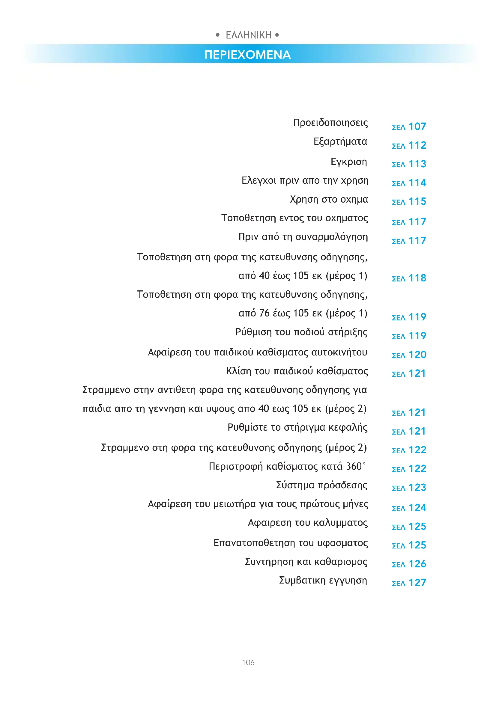 Ελεγχοι πριν απο την χρηση Χρηση στο οχημα Τοποθετηση εντος του οχηματος Πριν από τη συναρμολόγηση Τοποθετηση στη φορα της κατευθυνσης οδηγησης, από 40 έως 105 εκ (μέρος 1) Τοποθετηση στη φορα της κατευθυνσης οδηγησης, από 76 έως 105 εκ (μέρος 1) Ρύθμιση του ποδιού στήριξης Αφαίρεση του παιδικού καθίσματος αυτοκινήτου Κλίση του παιδικού καθίσματος Στραμμενο στην αντιθετη φορα της κατευθυνσης οδηγησης για παιδια απο τη γεννηση και υψους απο 40 εως 105 εκ (μέρος 2) Ρυθμίστε το στήριγμα κεφαλής Στραμμενο στη φορα της κατευθυνσης οδηγησης (μέρος 2) Περιστροφή καθίσματος κατά 360° Σύστημα πρόσδεσης Αφαίρεση του μειωτήρα για τους πρώτους μήνες Αφαιρεση του καλυμματος Επανατοποθετηση του υφασματος Συντηρηση και καθαρισμος Συμβατικη εγγυηση• ΕΛΛΗΝΙΚΗ •