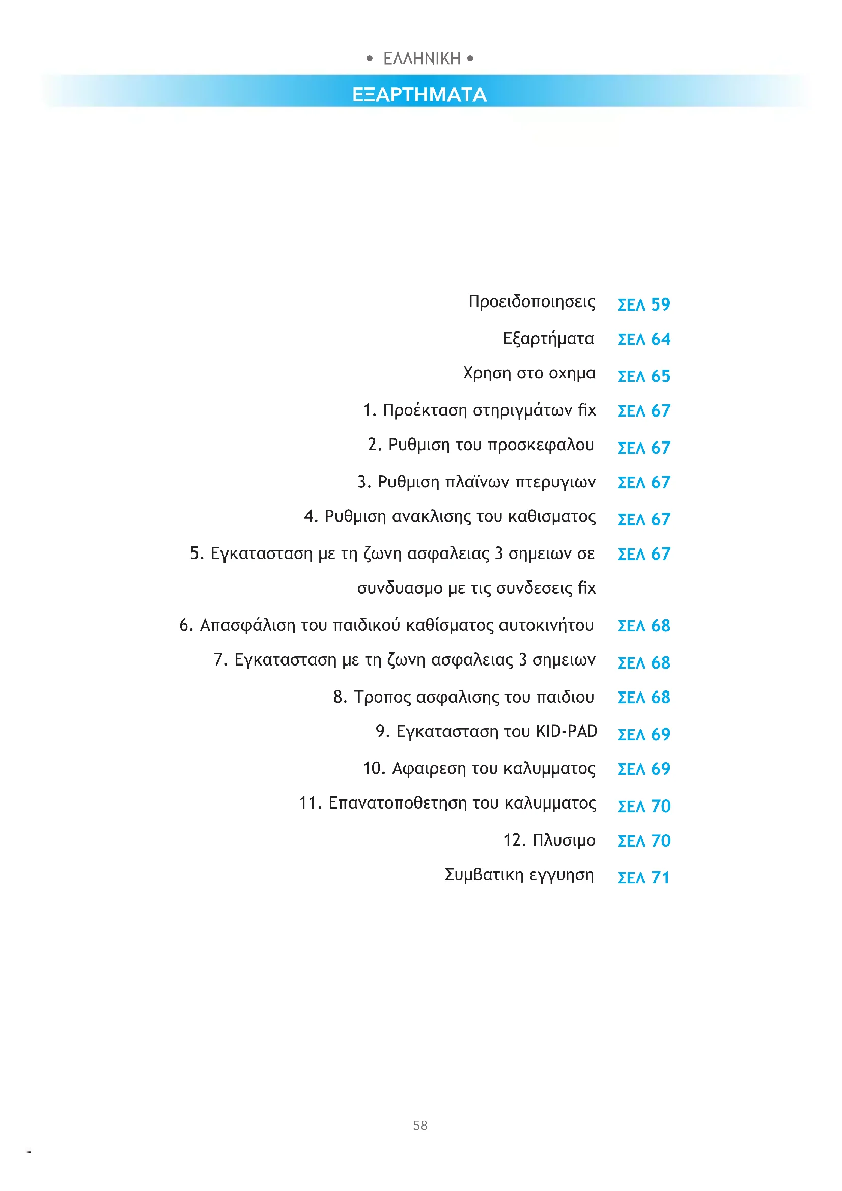 - ΠΡΟΕΙΔΟΠΟΙΗΣΗ: Θα πρέπει να αντικαταστήσετε το καρεκλάκι αυτοκινήτου σε περίπτωση που έχει υποστεί βίαιη καταπόνηση λόγω ατυχήματος που μπορεί να έχει προκαλέσει κάποιο μη εμφανές εσωτερικό σπάσιμο ή σε περίπτωση φθοράς. Το προϊόν ενδέχεται να φέρει εσωτερικές βλάβες που δεν είναι ορατές αλλά ενδέχεται να θέσουν σε κίνδυνο την ασφάλεια του παιδιού.• ΕΛΛΗΝΙΚΗ • • ΕΛΛΗΝΙΚΗ •