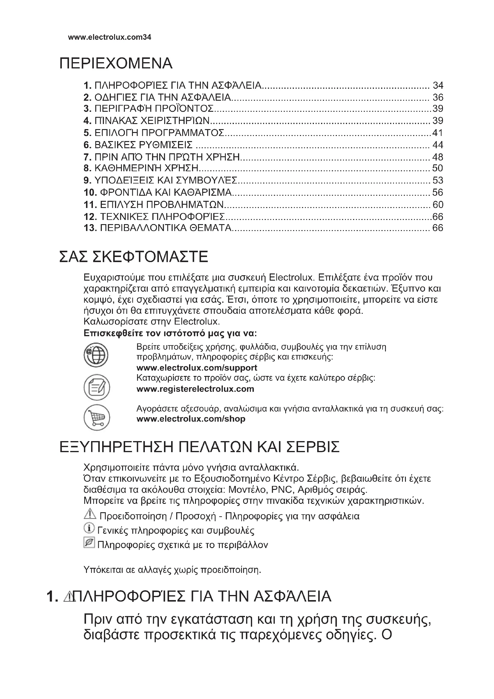 ΣΑΣ ΣΚΕΦΤΟΜΑΣΤΕ Ευχαριστούμε που επιλέξατε μια συσκευή Electrolux. Επιλέξατε ένα προϊόν που χαρακτηρίζεται από επαγγελματική εμπειρία και καινοτομία δεκαετιών. Έξυπνο και κομψό, έχει σχεδιαστεί για εσάς. Έτσι, όποτε το χρησιμοποιείτε, μπορείτε να είστε ήσυχοι ότι θα επιτυγχάνετε σπουδαία αποτελέσματα κάθε φορά. Καλωσορίσατε στην Electrolux. Επισκεφθείτε τον ιστότοπό μας για να: Βρείτε υποδείξεις χρήσης, φυλλάδια, συμβουλές για την επίλυση προβλημάτων, πληροφορίες σέρβις και επισκευής: www.electrolux.com/support Καταχωρίσετε το προϊόν σας, ώστε να έχετε καλύτερο σέρβις: www.registerelectrolux.com Αγοράσετε αξεσουάρ, αναλώσιμα και γνήσια ανταλλακτικά για τη συσκευή σας: www.electrolux.com/shop ΕΞΥΠΗΡΕΤΗΣΗ ΠΕΛΑΤΩΝ ΚΑΙ ΣΕΡΒΙΣ Χρησιμοποιείτε πάντα μόνο γνήσια ανταλλακτικά. Όταν επικοινωνείτε με το Εξουσιοδοτημένο Κέντρο Σέρβις, βεβαιωθείτε ότι έχετε διαθέσιμα τα ακόλουθα στοιχεία: Μοντέλο, PNC, Αριθμός σειράς. Μπορείτε να βρείτε τις πληροφορίες στην πινακίδα τεχνικών χαρακτηριστικών. Προειδοποίηση / Προσοχή - Πληροφορίες για την ασφάλεια Γενικές πληροφορίες και συμβουλές Πληροφορίες σχετικά με το περιβάλλον Υπόκειται αε αλλαγές χωρίς προειδποίηση.