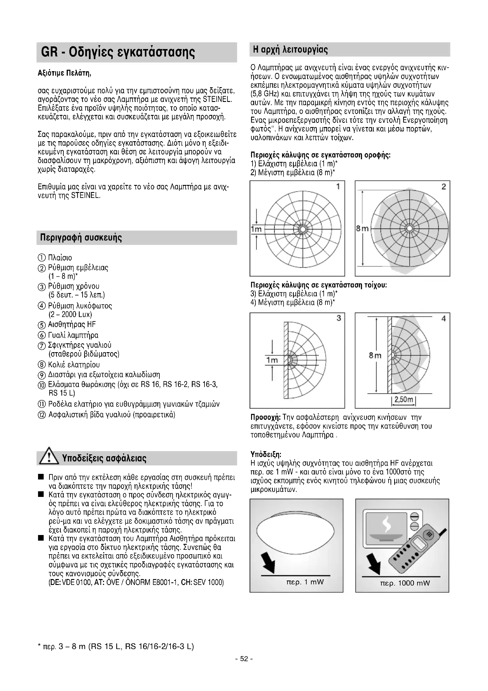 PRODUSENT ÅRS GARANTI Serie RS_110077119_BDAL Serie RS_24spr_neu.qxp 09.11.21 12:42 Seite 52GR - Οδηγίες εγκατάστασης Αξιτιμε Πελάτη, σας ευχαριστούμε πολύ για την εμπιστοσύνη που μας δείξατε, αγοράζοντας το νέο σας Λαμπτήρα με ανιχνετή της STEINEL. Επιλέξατε ένα προϊν υψηλής ποιτητας, το οποίο κατασ- κευάζεται, ελέγχεται και συσκευάζεται με μεγάλη προσοχή. Σας παρακαλούμε, πριν απ την εγκατάσταση να εξοικειωθείτε με τις παρούσες οδηγίες εγκατάστασης. Διτι μνο η εξειδι- κευμένη εγκατάσταση και θέση σε λειτουργία μπορούν να διασφαλίσουν τη μακρχρονη, αξιπιστη και άψογη λειτουργία χωρίς διαταραχές. Επιθυμία μας είναι να χαρείτε το νέο σας Λαμπτήρα με ανιχ- νευτή της STEINEL. Περιγραφή συσκευής Η αρχή λειτουργίας Ο Λαμπτήρας με ανιχνευτή είναι ένας ενεργς ανιχνευτής κιν- ήσεων. Ο ενσωματωμένος αισθητήρας υψηλών συχνοτήτων εκπέμπει ηλεκτρομαγνητικά κύματα υψηλών συχνοτήτων (5,8 GHz) και επιτυγχάνει τη λήψη της ηχούς των κυμάτων αυτών. Με την παραμικρή κίνηση εντς της περιοχής κάλυψης του Λαμπτήρα, ο αισθητήρας εντοπίζει την αλλαγή της ηχούς. Eνας μικροεπεξεργαστής δίνει ττε την εντολή Ενεργοποίηση φωτς“. Η ανίχνευση μπορεί να γίνεται και μέσω πορτών, υαλοπινάκων και λεπτών τοίχων. Περιοχές κάλυψης σε εγκατάσταση οροφής: