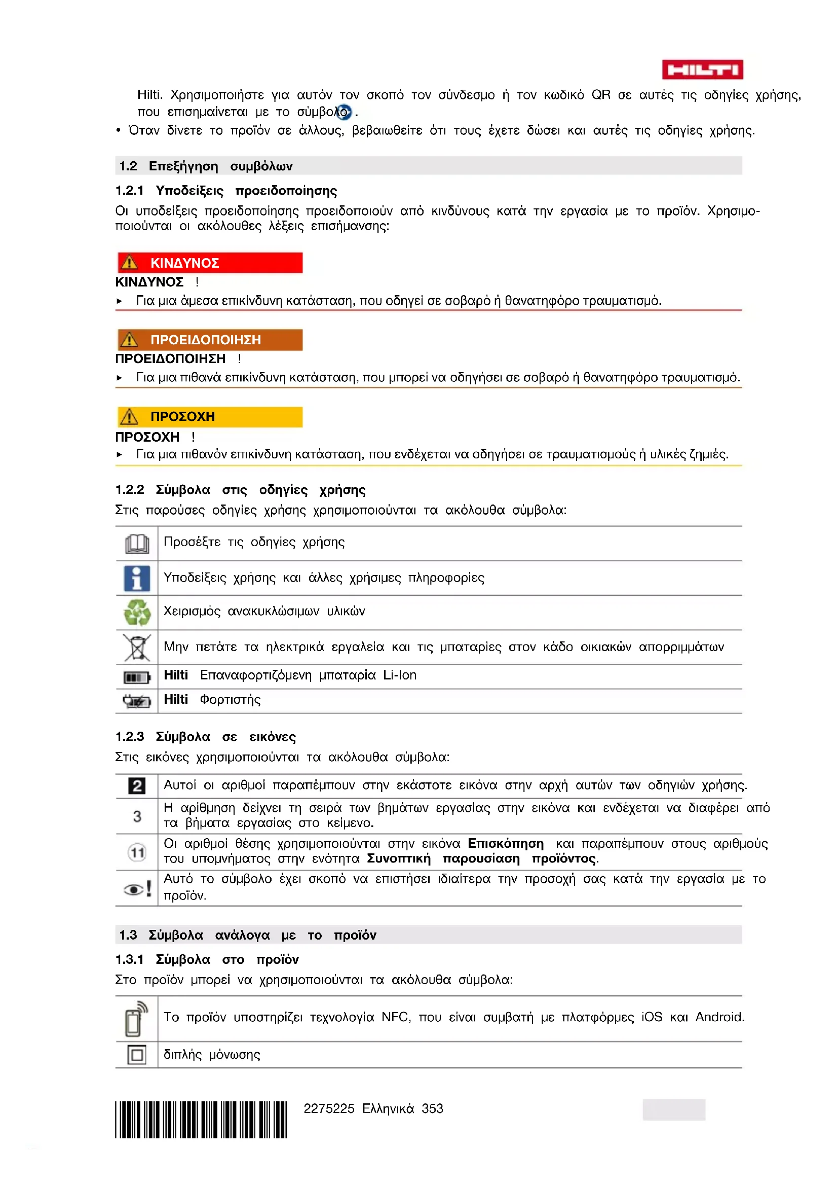 - Οι συνημμένες οδηγίες χρήσης αντιστοιχούν στο τρέχον επίπεδο της τεχνολογίας τη στιγμή της εκτύπωσης. Μπορείτε να βρίσκετε πάντα την τρέχουσα έκδοση online στη σελίδα προϊόντων της*2275225* 2275225 Ελληνικά 353 Hilti. Χρησιμοποιήστε για αυτόν τον σκοπό τον σύνδεσμο ή τον κωδικό QR σε αυτές τις οδηγίες χρήσης, που επισημαίνεται με το σύμβολο .