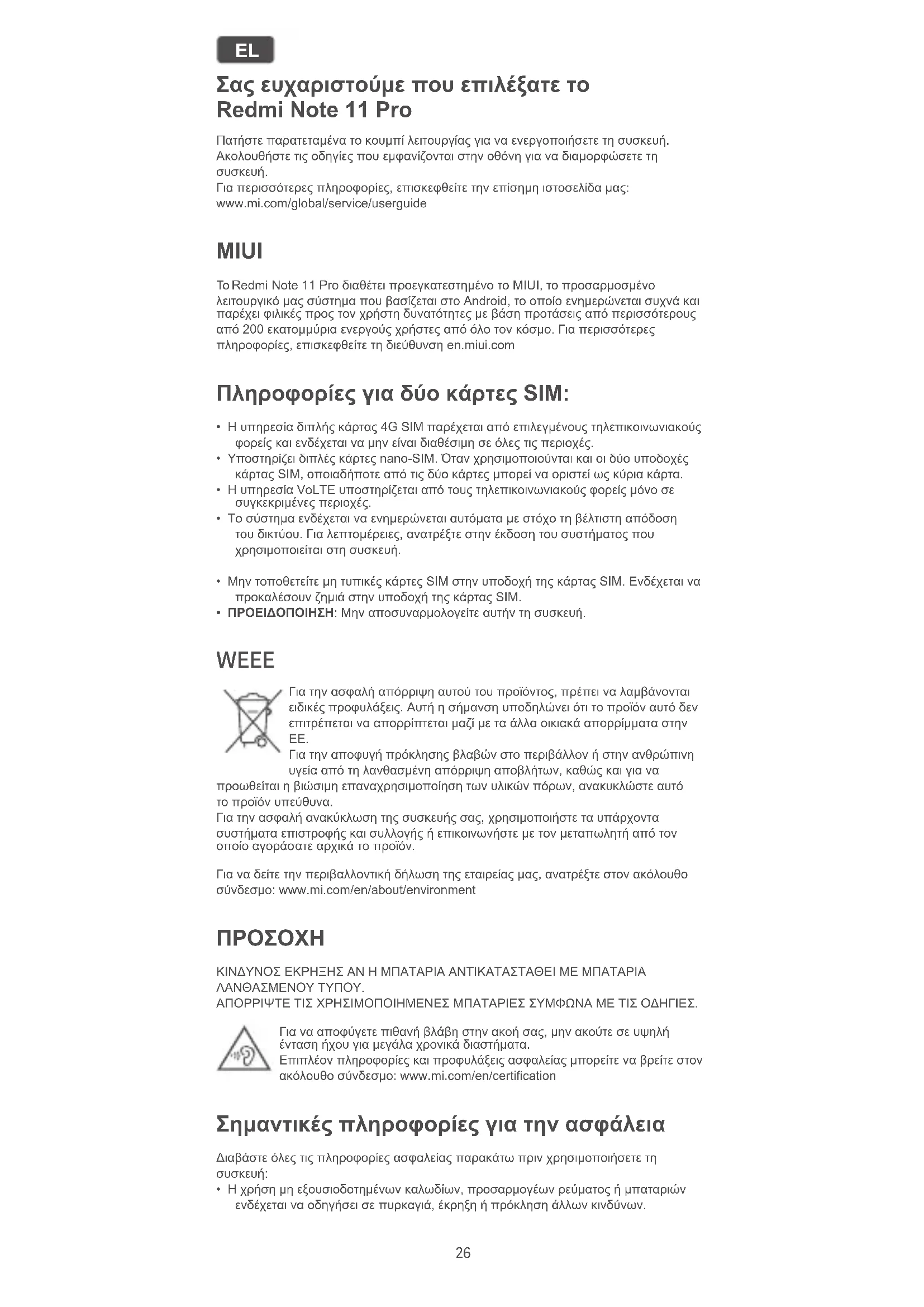 Για περισσότερες πληροφορίες, επισκεφθείτε την επίσημη ιστοσελίδα μας: www.mi.com/global/service/userguide MIUI Το Redmi Note 11 Pro διαθέτει προεγκατεστημένο το MIUI, το προσαρμοσμένο λειτουργικό μας σύστημα που βασίζεται στο Android, το οποίο ενημερώνεται συχνά και παρέχει φιλικές προς τον χρήστη δυνατότητες με βάση προτάσεις από περισσότερους από 200 εκατομμύρια ενεργούς χρήστες από όλο τον κόσμο. Για περισσότερες πληροφορίες, επισκεφθείτε τη διεύθυνση en.miui.com Πληροφορίες για δύο κάρτες SIM: