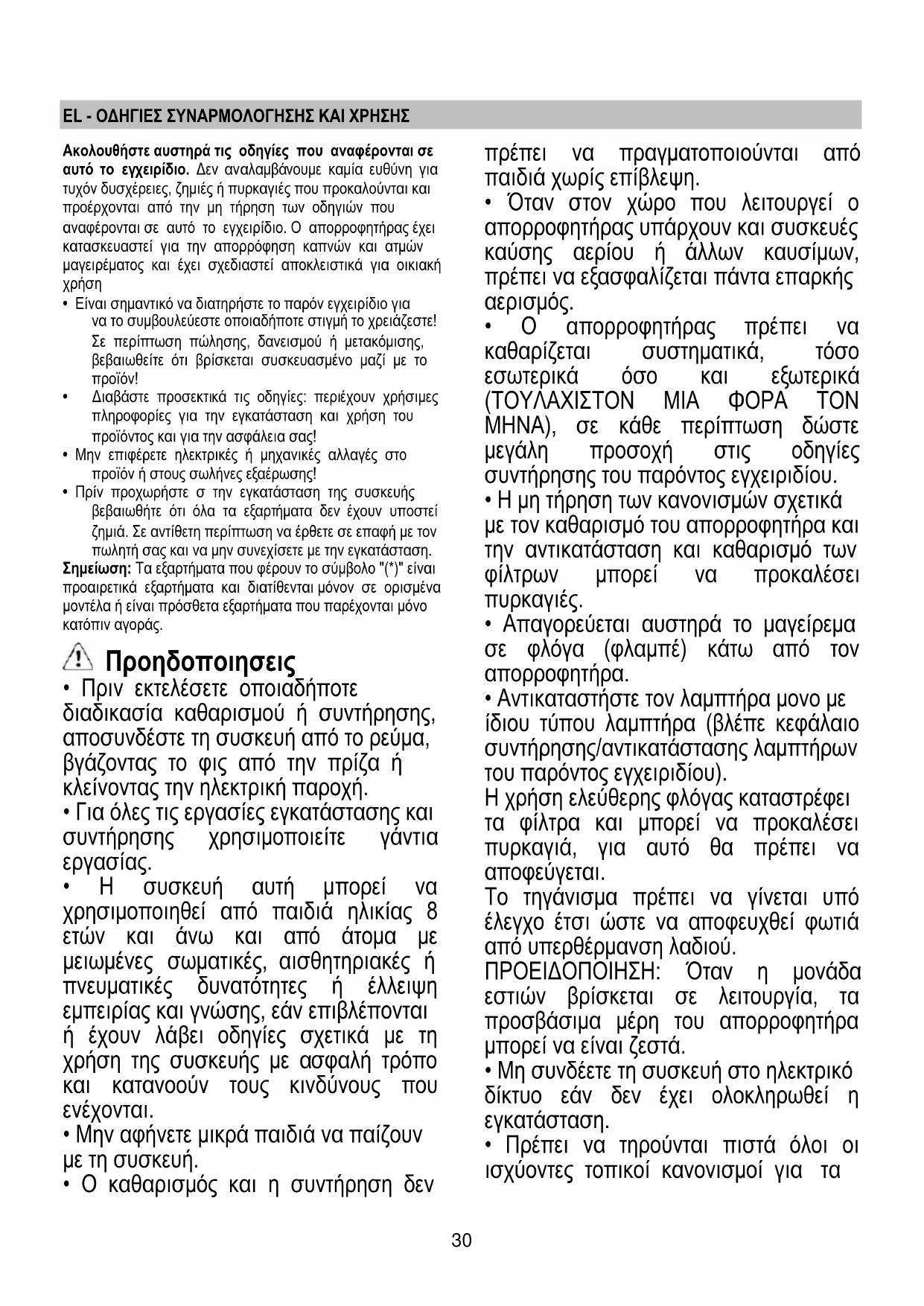 - Όταν στον χώρο που λειτουργεί ο απορροφητήρας υπάρχουν και συσκευές καύσης αερίου ή άλλων καυσίμων, πρέπει να εξασφαλίζεται πάντα επαρκής
