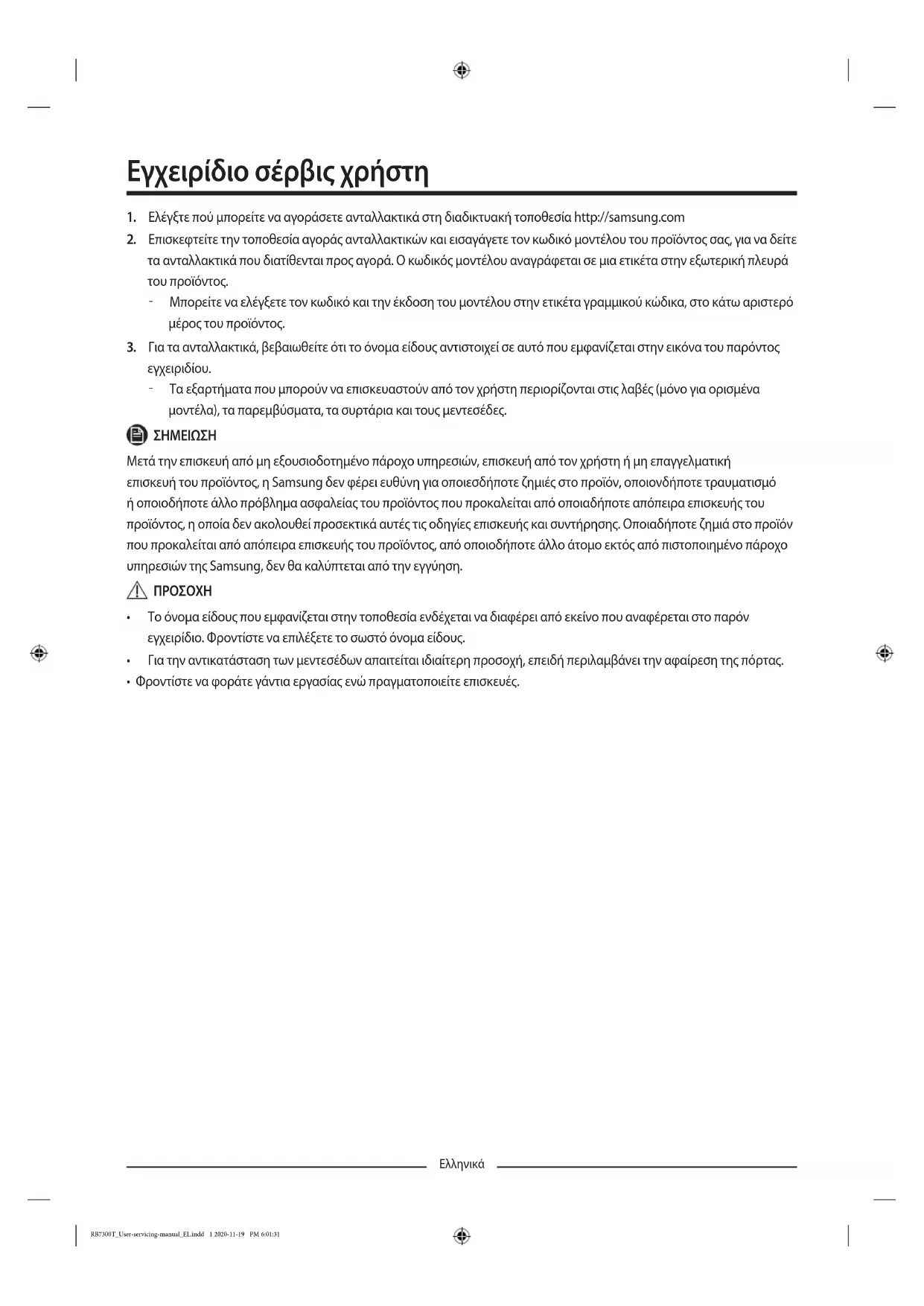 - Φροντίστε να φοράτε γάντια εργασίας ενώ πραγματοποιείτε επισκευές. RB7300T_User-servicing-manual_EL.indd 1 2020-11-19 PM 6:01:31Ελληνικά Η πραγματική εμφάνιση και τα παρεχόμενα εξαρτήματα του ψυγείου ενδέχεται να διαφέρουν, ανάλογα με το μοντέλο και τη