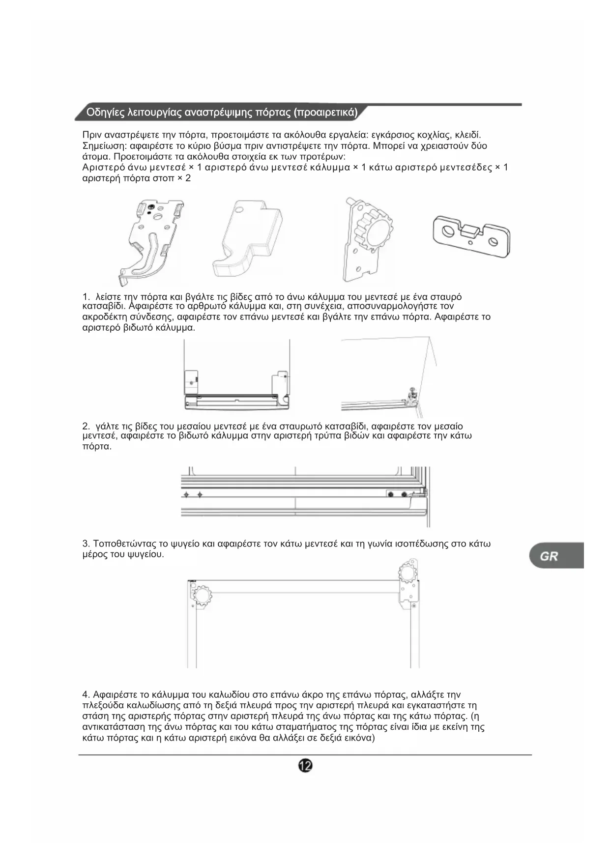 Πιέστ ε για 3" για Ξεκλείδ ωμα(Προαιρετικός)Οδηγίες λειτουργίας αναστρέψιµης πόρτας ( προαιρετικά) Πριν αναστρέψετε την πόρτα, προετοιμάστε τα ακόλουθα εργαλεία: εγκάρσιος κοχλίας, κλειδί. Σημείωση: αφαιρέστε το κύριο βύσμα πριν αντιστρέψετε την πόρτα. Μπορεί να χρειαστούν δύο άτομα. Προετοιμάστε τα ακόλουθα στοιχεία εκ των προτέρων: Αριστερό άνω μεντεσέ × 1 αριστερό άνω μεντεσέ κάλυμμα × 1 κάτω αριστερό μεντεσέδες × 1 αριστερή πόρτα στοπ × 2