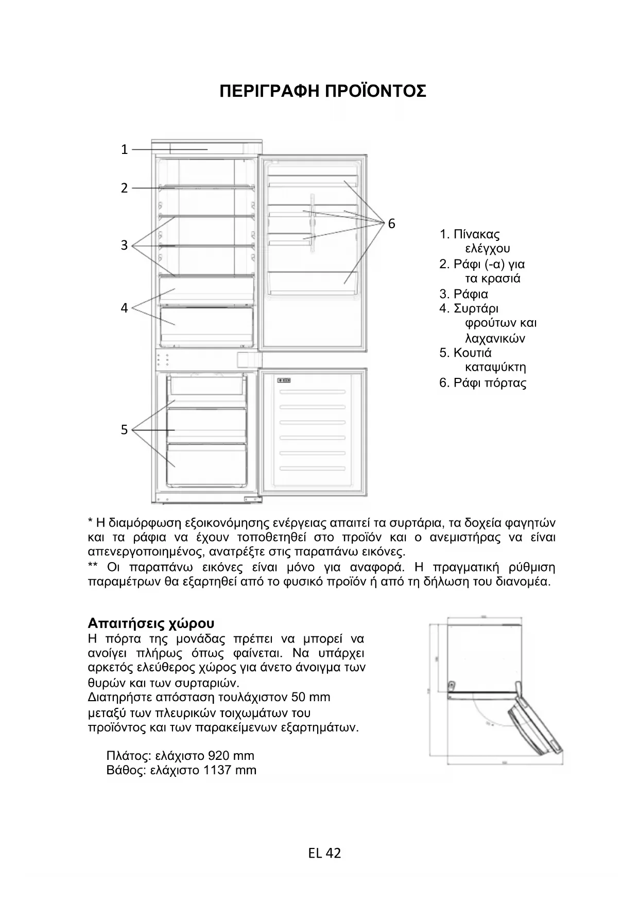 - Η διαμόρφωση εξοικονόμησης ενέργειας απαιτεί τα συρτάρια, τα δοχεία φαγητών και τα ράφια να έχουν τοποθετηθεί στο προϊόν και ο ανεμιστήρας να είναι απενεργοποιημένος, ανατρέξτε στις παραπάνω εικόνες. ** Οι παραπάνω εικόνες είναι μόνο για αναφορά. Η πραγματική ρύθμιση παραμέτρων θα εξαρτηθεί από το φυσικό προϊόν ή από τη δήλωση του διανομέα. Απαιτήσεις χώρου Η πόρτα της μονάδας πρέπει να μπορεί να ανοίγει πλήρως όπως φαίνεται. Να υπάρχει αρκετός ελεύθερος χώρος για άνετο άνοιγμα των θυρών και των συρταριών. Διατηρήστε απόσταση τουλάχιστον 50 mm μεταξύ των πλευρικών τοιχωμάτων του προϊόντος και των παρακείμενων εξαρτημάτων.Πλάτος: ελάχιστο 920 mmΒάθος: ελάχιστο 1137 mm1. Πίνακαςελέγχου2. Ράφι (-α) γιατα κρασιά3. Ράφια4. Συρτάριφρούτων καιλαχανικών5. Κουτιάκαταψύκτη6. Ράφι πόρτας