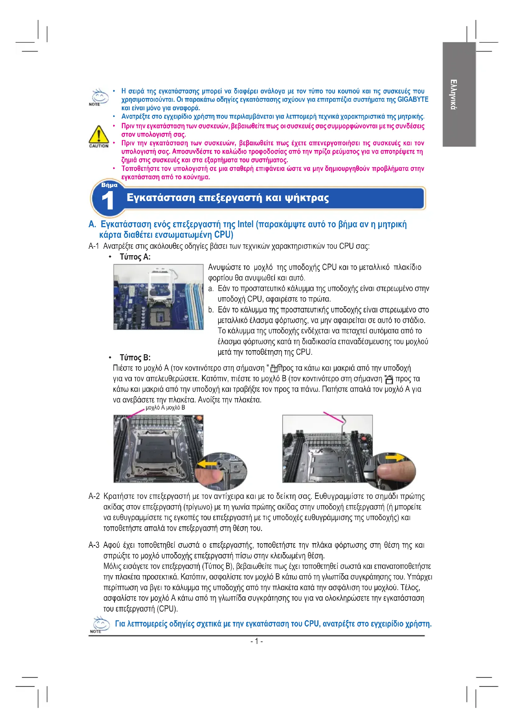 Ανυψώστε το μοχλό της υποδοχής CPU και το μεταλλικό πλακίδιο φορτίου θα ανυψωθεί και αυτό. a. Εάν το προστατευτικό κάλυμμα της υποδοχής είναι στερεωμένο στην υποδοχή CPU, αφαιρέστε το πρώτα. b. Εάν το κάλυμμα της προστατευτικής υποδοχής είναι στερεωμένο στο μεταλλικό έλασμα φόρτωσης, να μην αφαιρείται σε αυτό το στάδιο. Το κάλυμμα της υποδοχής ενδέχεται να πεταχτεί αυτόματα από το έλασμα φόρτωσης κατά τη διαδικασία επαναδέσμευσης του μοχλού μετά την τοποθέτηση της CPU. Για λεπτομερείς οδηγίες σχετικά με την εγκατάσταση του CPU, ανατρέξτε στο εγχειρίδιο χρήστη. μοχλό A μοχλό B A-2 Κρατήστε τον επεξεργαστή με τον αντίχειρα και με το δείκτη σας. Ευθυγραμμίστε το σημάδι πρώτης ακίδας στον επεξεργαστή (τρίγωνο) με τη γωνία πρώτης ακίδας στην υποδοχή επεξεργαστή (ή μπορείτε να ευθυγραμμίσετε τις εγκοπές του επεξεργαστή με τις υποδοχές ευθυγράμμισης της υποδοχής) και τοποθετήστε απαλά τον επεξεργαστή στη θέση του. A-3 Αφού έχει τοποθετηθεί σωστά ο επεξεργαστής, τοποθετήστε την πλάκα φόρτωσης στη θέση της και σπρώξτε το μοχλό υποδοχής επεξεργαστή πίσω στην κλειδωμένη θέση. Μόλις εισάγετε τον επεξεργαστή (Τύπος B), βεβαιωθείτε πως έχει τοποθετηθεί σωστά και επανατοποθετήστε την πλακέτα προσεκτικά. Κατόπιν, ασφαλίστε τον μοχλό Β κάτω από τη γλωττίδα συγκράτησης του. Υπάρχει περίπτωση να βγει το κάλυμμα της υποδοχής από την πλακέτα κατά την ασφάλιση του μοχλού. Τέλος, ασφαλίστε τον μοχλό Α κάτω από τη γλωττίδα συγκράτησης του για να ολοκληρώσετε την εγκατάσταση του επεξεργαστή (CPU).- 2 -