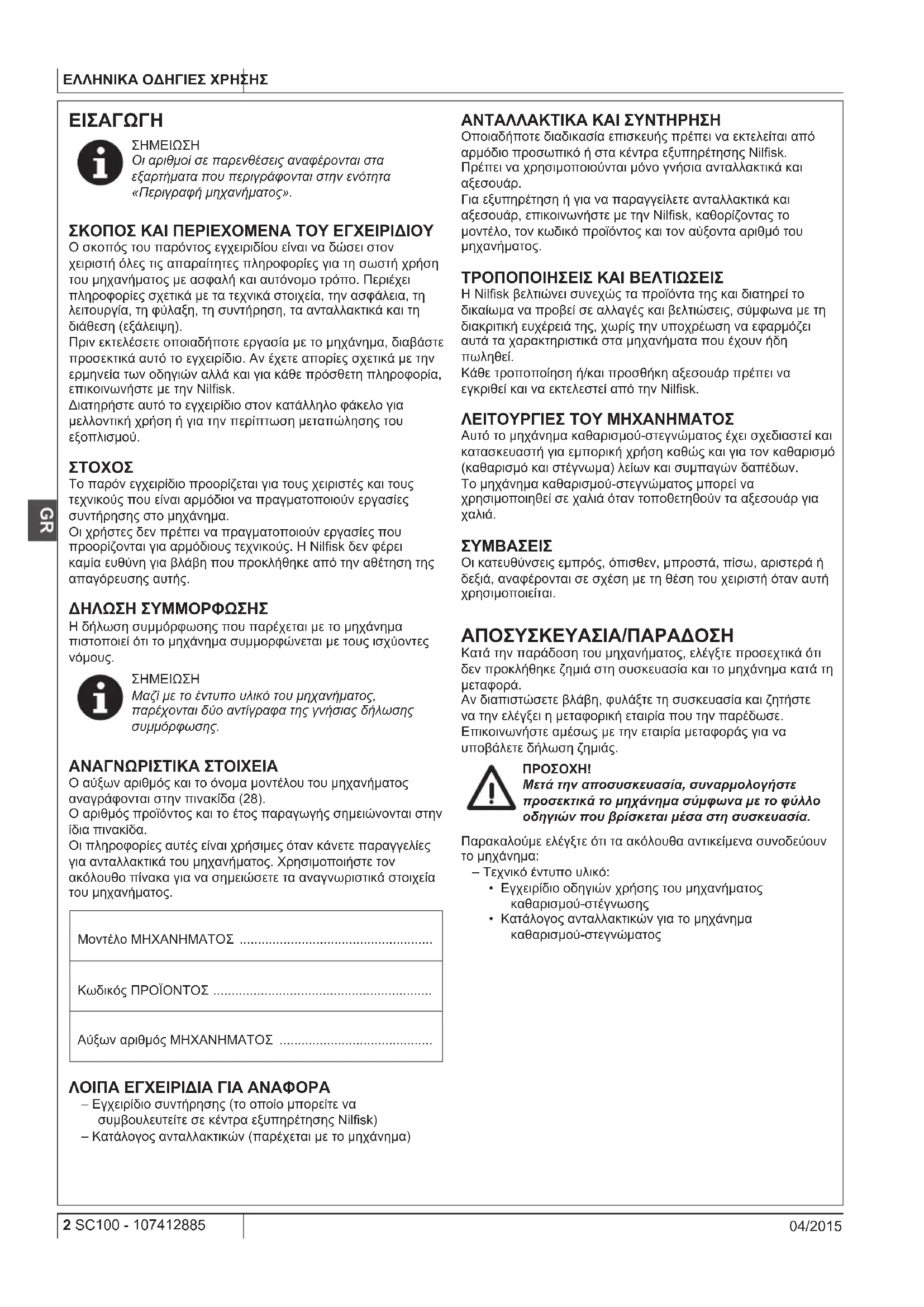- Κατάλογος ανταλλακτικών για το μηχάνημα καθαρισμού-στεγνώματος 107412885(1)04-2015 A.indb 2 16/09/2015 16:54:41ΟΔΗΓΙΕΣ ΧΡΗΣΗΣ ΕΛΛΗΝΙΚΑ 107412885 - SC100 3 04/2015