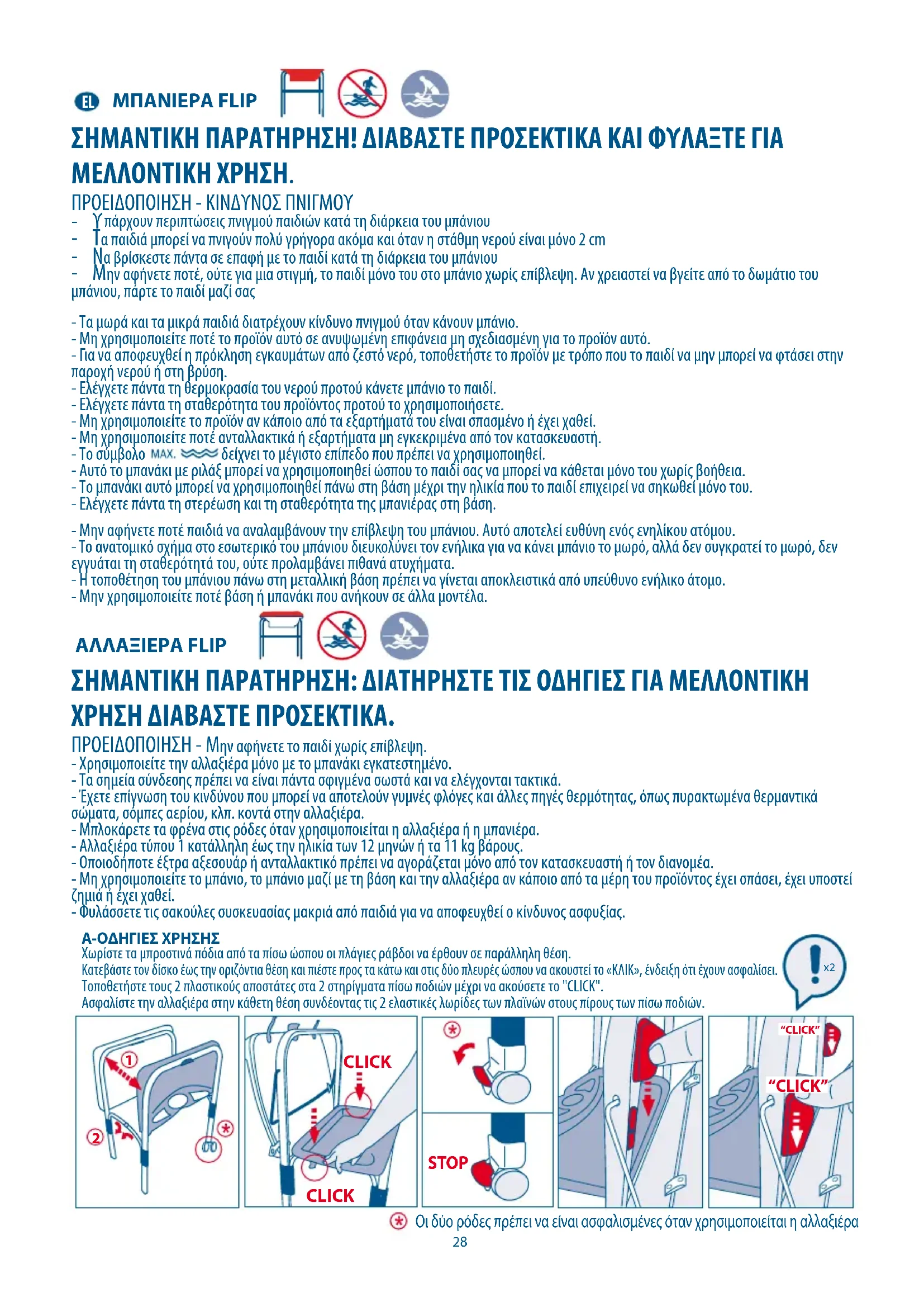 πάρχουν περιπτώσεις πνιγμού παιδιών κατά τη διάρκεια του μπάνιου - Τα παιδιά μπορεί να πνιγούν πολύ γρήγορα ακόμα και όταν η στάθμη νερού είναι μόνο 2 cm - Να βρίσκεστε πάντα σε επαφή με το παιδί κατά τη διάρκεια του μπάνιου - Μην αφήνετε ποτέ, ούτε για μια στιγμή, το παιδί μόνο του στο μπάνιο χωρίς επίβλεψη. Αν χρειαστεί να βγείτε από το δωμάτιο του μπάνιου, πάρτε το παιδί μαζί σας - Τα μωρά και τα μικρά παιδιά διατρέχουν κίνδυνο πνιγμού όταν κάνουν μπάνιο. - Μη χρησιμοποιείτε ποτέ το προϊόν αυτό σε ανυψωμένη επιφάνεια μη σχεδιασμένη για το προϊόν αυτό. - Για να αποφευχθεί η πρόκληση εγκαυμάτων από ζεστό νερό, τοποθετήστε το προϊόν με τρόπο που το παιδί να μην μπορεί να φτάσει στην παροχή νερού ή στη βρύση. - Ελέγχετε πάντα τη θερμοκρασία του νερού προτού κάνετε μπάνιο το παιδί. - Ελέγχετε πάντα τη σταθερότητα του προϊόντος προτού το χρησιμοποιήσετε. - Μη χρησιμοποιείτε το προϊόν αν κάποιο από τα εξαρτήματά του είναι σπασμένο ή έχει χαθεί. - Μη χρησιμοποιείτε ποτέ ανταλλακτικά ή εξαρτήματα μη εγκεκριμένα από τον κατασκευαστή. - Το σύμβολο δείχνει το μέγιστο επίπεδο που πρέπει να χρησιμοποιηθεί. - Αυτό το μπανάκι με ριλάξ μπορεί να χρησιμοποιηθεί ώσπου το παιδί σας να μπορεί να κάθεται μόνο του χωρίς βοήθεια. - Το μπανάκι αυτό μπορεί να χρησιμοποιηθεί πάνω στη βάση μέχρι την ηλικία που το παιδί επιχειρεί να σηκωθεί μόνο του. - Ελέγχετε πάντα τη στερέωση και τη σταθερότητα της μπανιέρας στη βάση. - Μην αφήνετε ποτέ παιδιά να αναλαμβάνουν την επίβλεψη του μπάνιου. Αυτό αποτελεί ευθύνη ενός ενηλίκου ατόμου. - Το ανατομικό σχήμα στο εσωτερικό του μπάνιου διευκολύνει τον ενήλικα για να κάνει μπάνιο το μωρό, αλλά δεν συγκρατεί το μωρό, δεν εγγυάται τη σταθερότητά του, ούτε προλαμβάνει πιθανά ατυχήματα. - Η τοποθέτηση του μπάνιου πάνω στη μεταλλική βάση πρέπει να γίνεται αποκλειστικά από υπεύθυνο ενήλικο άτομο. - Μην χρησιμοποιείτε ποτέ βάση ή μπανάκι που ανήκουν σε άλλα μοντέλα. Α-ΟΔΗΓΙΕΣ ΧΡΗΣΗΣΧωρίστε τα μπροστινά πόδια από τα πίσω ώσπου οι πλάγιες ράβδοι να έρθουν σε παράλληλη θέση. Κατεβάστε τον δίσκο έως την οριζόντια θέση και πιέστε προς τα κάτω και στις δύο πλευρές ώσπου να ακουστεί το «ΚΛΙΚ», ένδειξη ότι έχουν ασφαλίσει. Τοποθετήστε τους 2 πλαστικούς αποστάτες στα 2 στηρίγματα πίσω ποδιών μέχρι να ακούσετε το "CLICK".Ασφαλίστε την αλλαξιέρα στην κάθετη θέση συνδέοντας τις 2 ελαστικές λωρίδες των πλαϊνών στους πίρους των πίσω ποδιών. ΣΗΜΑΝΤΙΚΗ ΠΑΡΑΤΗΡΗΣΗ: ΔΙΑΤΗΡΗΣΤΕ ΤΙΣ ΟΔΗΓΙΕΣ ΓΙΑ ΜΕΛΛΟΝΤΙΚΗ ΧΡΗΣΗ ΔΙΑΒΑΣΤΕ ΠΡΟΣΕΚΤΙΚΑ. ΠΡΟΕΙΔΟΠΟΙΗΣΗ - Μην αφήνετε το παιδί χωρίς επίβλεψη. - Χρησιμοποιείτε την αλλαξιέρα μόνο με το μπανάκι εγκατεστημένο. - Τα σημεία σύνδεσης πρέπει να είναι πάντα σφιγμένα σωστά και να ελέγχονται τακτικά. - Έχετε επίγνωση του κινδύνου που μπορεί να αποτελούν γυμνές φλόγες και άλλες πηγές θερμότητας, όπως πυρακτωμένα θερμαντικά σώματα, σόμπες αερίου, κλπ. κοντά στην αλλαξιέρα. - Μπλοκάρετε τα φρένα στις ρόδες όταν χρησιμοποιείται η αλλαξιέρα ή η μπανιέρα. - Αλλαξιέρα τύπου 1 κατάλληλη έως την ηλικία των 12 μηνών ή τα 11 kg βάρους. - Οποιοδήποτε έξτρα αξεσουάρ ή ανταλλακτικό πρέπει να αγοράζεται μόνο από τον κατασκευαστή ή τον διανομέα. - Μη χρησιμοποιείτε το μπάνιο, το μπάνιο μαζί με τη βάση και την αλλαξιέρα αν κάποιο από τα μέρη του προϊόντος έχει σπάσει, έχει υποστεί ζημιά ή έχει χαθεί. - Φυλάσσετε τις σακούλες συσκευασίας μακριά από παιδιά γι