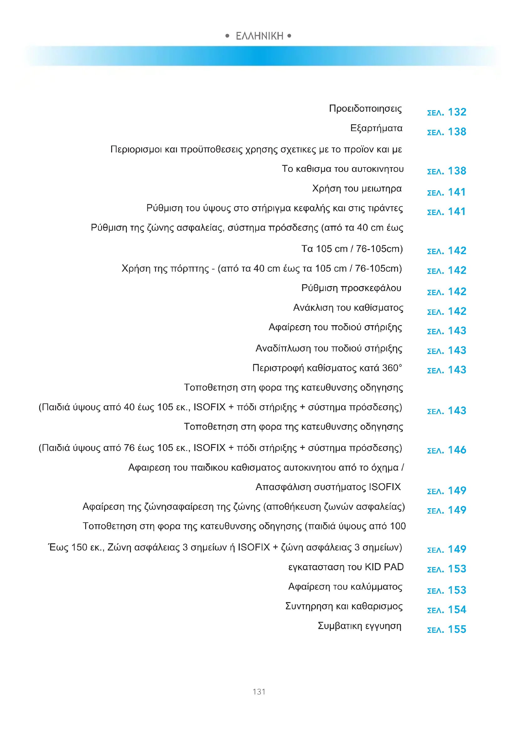 Περιορισμοι και προϋποθεσεις χρησης σχετικες με το προϊον και με Το καθισμα του αυτοκινητου Χρήση του μειωτηρα Ρύθμιση του ύψους στο στήριγμα κεφαλής και στις τιράντες Ρύθμιση της ζώνης ασφαλείας, σύστημα πρόσδεσης (από τα 40 cm έως Τα 105 cm / 76-105cm) Χρήση της πόρπτης - (από τα 40 cm έως τα 105 cm / 76-105cm) Ρύθμιση προσκεφάλου Ανάκλιση του καθίσματος Αφαίρεση του ποδιού στήριξης Αναδίπλωση του ποδιού στήριξης Περιστροφή καθίσματος κατά 360° Τοποθετηση στη φορα της κατευθυνσης οδηγησης (Παιδιά ύψους από 40 έως 105 εκ., ISOFIX + πόδι στήριξης + σύστημα πρόσδεσης) Τοποθετηση στη φορα της κατευθυνσης οδηγησης (Παιδιά ύψους από 76 έως 105 εκ., ISOFIX + πόδι στήριξης + σύστημα πρόσδεσης) Αφαιρεση του παιδικου καθισματος αυτοκινητου από το όχημα / Απασφάλιση συστήματος ISOFIX Αφαίρεση της ζώνησαφαίρεση της ζώνης (αποθήκευση ζωνών ασφαλείας) Τοποθετηση στη φορα της κατευθυνσης οδηγησης (παιδιά ύψους από 100 Έως 150 εκ., Ζώνη ασφάλειας 3 σημείων ή ISOFIX + ζώνη ασφάλειας 3 σημείων) εγκατασταση του KID PAD Αφαίρεση του καλύμματος Συντηρηση και καθαρισμος Συμβατικη εγγυηση• ΕΛΛΗΝΙΚΗ • • ΕΛΛΗΝΙΚΗ •