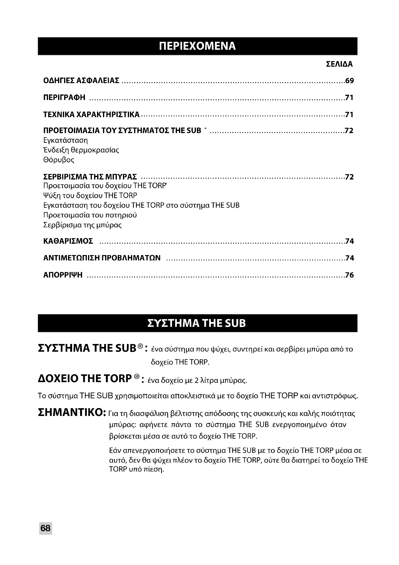 : ένα δοχείο με 2 λίτρα μπύρας. Το σύστημα THE SUB χρησιμοποιείται αποκλειστικά με το δοχείο THE TORP και αντιστρόφως. ΣΗΜΑΝΤΙΚΟ: Για τη διασφάλιση βέλτιστης απόδοσης της συσκευής και καλής ποιότητας μπύρας: αφήνετε πάντα το σύστημα THE SUB ενεργοποιημένο όταν βρίσκεται μέσα σε αυτό το δοχείο THE TORP. Εάν απενεργοποιήσετε το σύστημα THE SUB με το δοχείο THE TORP μέσα σε αυτό, δεν θα ψύχει πλέον το δοχείο THE TORP, ούτε θα διατηρεί το δοχείο THE TORP υπό πίεση. ΠΕΡΙΕΧΟΜΕΝΑ ΣΥΣΤΗΜΑ THE SUB KR_MACHINE A BIERE_THE SUB_NC00120880_NC00120880 27/08/13 10:35 Page6869