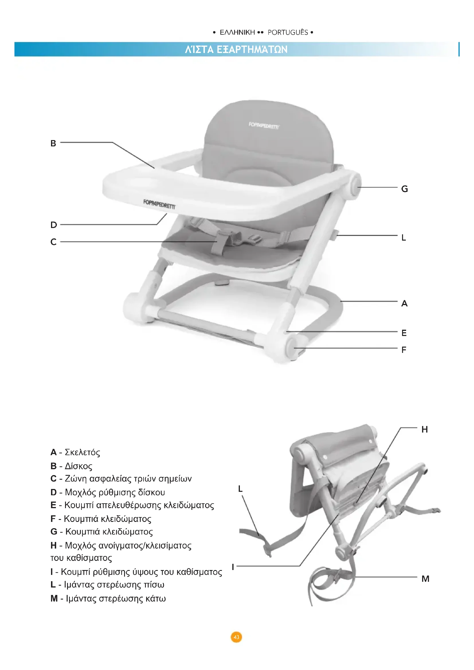 C - Ζώνη ασφαλείας τριών σημείων D - Μοχλός ρύθμισης δίσκου E - Κουμπί απελευθέρωσης κλειδώματος F - Κουμπιά κλειδώματος G - Κουμπιά κλειδώματος H - Μοχλός ανοίγματος/κλεισίματος του καθίσματος I - Κουμπί ρύθμισης ύψους του καθίσματος L - Ιμάντας στερέωσης πίσω Μ - Ιμάντας στερέωσης κάτω