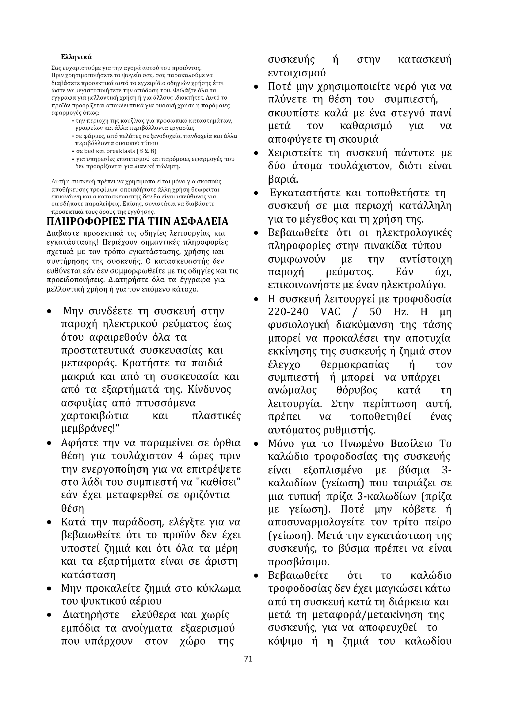 Σας ευχαριστούμε για την αγορά αυτού του προϊόντος. Πριν χρησιμοποιήσετε το ψυγείο σας, σας παρακαλούμε να διαβάσετε προσεκτικά αυτό το εγχειρίδιο οδηγιών χρήσης έτσι ώστε να μεγιστοποιήσετε την απόδοση του. Φυλάξτε όλα τα έγγραφα για μελλοντική χρήση ή για άλλους ιδιοκτήτες. Αυτό το προϊόν προορίζεται αποκλειστικά για οικιακή χρήση ή παρόμοιες εφαρμογές όπως: - την περιοχή της κουζίνας για προσωπικό καταστημάτων, γραφείων και άλλα περιβάλλοντα εργασίας - σε φάρμες, από πελάτες σε ξενοδοχεία, πανδοχεία και άλλα περιβάλλοντα οικιακού τύπου - σε bed και breakfasts (B & B) - για υπηρεσίες επισιτισμού και παρόμοιες εφαρμογές που δεν προορίζονται για λιανική πώληση. η συσκευή πρέπει να χρησιμοποιείται μόνο για σκοπούς αποθήκευσης τροφίμων, οποιαδήποτε άλλη χρήση θεωρείται επικίνδυνη και ο κατασκευαστής δεν θα είναι υπεύθυνος για οιεσδήποτε παραλείψεις. Επίσης, συνιστάται να διαβάσετε προσεκτικά τους όρους της εγγύησης. ΠΛΗΡΟΦΟΡΙΕΣ ΓΙΑ ΤΗΝ ΑΣΦΑΛΕΙΑ Διαβάστε προσεκτικά τις οδηγίες λειτουργίας και εγκατάστασης! Περιέχουν σημαντικές πληροφορίες σχετικά με τον τρόπο εγκατάστασης, χρήσης και συντήρησης της συσκευής. Ο κατασκευαστής δεν ευθύνεται εάν δεν συμμορφωθείτε με τις οδηγίες και τις προειδοποιήσεις. Διατηρήστε όλα τα έγγραφα για μελλοντική χρήση ή για τον επόμενο κάτοχο.