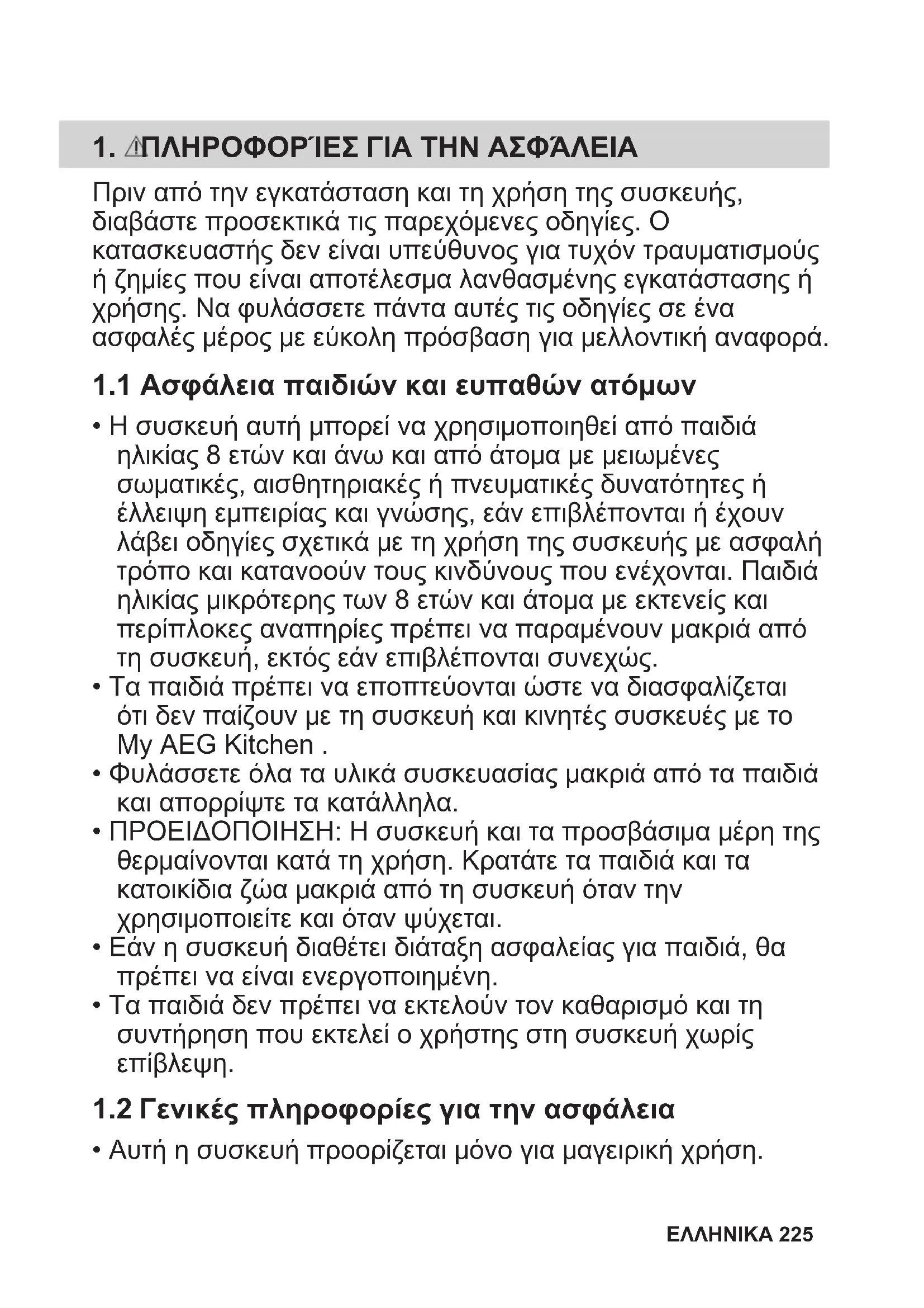 ΕΛΛΗΝΙΚΑ 223My AEG Kitchen app 224 ΕΛΛΗΝΙΚΑ1. ΠΛΗΡΟΦΟΡΊΕΣ ΓΙΑ ΤΗΝ ΑΣΦΆΛΕΙΑ Πριν από την εγκατάσταση και τη χρήση της συσκευής, διαβάστε προσεκτικά τις παρεχόμενες οδηγίες. Ο κατασκευαστής δεν είναι υπεύθυνος για τυχόν τραυματισμούς ή ζημίες που είναι αποτέλεσμα λανθασμένης εγκατάστασης ή χρήσης. Να φυλάσσετε πάντα αυτές τις οδηγίες σε ένα ασφαλές μέρος με εύκολη πρόσβαση για μελλοντική αναφορά.