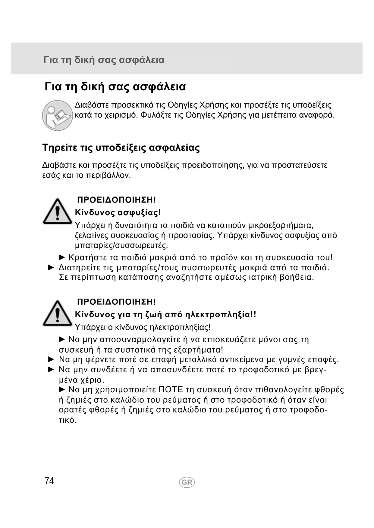 Για τη δική σας ασφάλεια Διαβάστε προσεκτικά τις Οδηγίες Χρήσης και προσέξτε τις υποδείξεις κατά το χειρισμό. Φυλάξτε τις Οδηγίες Χρήσης για μετέπειτα αναφορά. Τηρείτε τις υποδείξεις ασφαλείας Διαβάστε και προσέξτε τις υποδείξεις προειδοποίησης, για να προστατεύσετε εσάς και το περιβάλλον. ΠΡΟΕΙΔΟΠΟΙΗΣΗ! Κίνδυνος ασφυξίας! Υπάρχει η δυνατότητα τα παιδιά να καταπιούν μικροεξαρτήματα, ζελατίνες συσκευασίας ή προστασίας. Υπάρχει κίνδυνος ασφυξίας από μπαταρίες/συσσωρευτές. ► Κρατήστε τα παιδιά μακριά από το προϊόν και τη συσκευασία του! ► Διατηρείτε τις μπαταρίες/τους συσσωρευτές μακριά από τα παιδιά. Σε περίπτωση κατάποσης αναζητήστε αμέσως ιατρική βοήθεια. ΠΡΟΕΙΔΟΠΟΙΗΣΗ! Κίνδυνος για τη ζωή από ηλεκτροπληξία!! Υπάρχει ο κίνδυνος ηλεκτροπληξίας! ► Να μην αποσυναρμολογείτε ή να επισκευάζετε μόνοι σας τη συσκευή ή τα συστατικά της εξαρτήματα! ► Να μη φέρνετε ποτέ σε επαφή μεταλλικά αντικείμενα με γυμνές επαφές. ► Να μην συνδέετε ή να αποσυνδέετε ποτέ το τροφοδοτικό με βρεγ- μένα χέρια. ► Να μη χρησιμοποιείτε ΠΟΤΕ τη συσκευή όταν πιθανολογείτε φθορές ή ζημιές στο καλώδιο του ρεύματος ή στο τροφοδοτικό ή όταν είναι ορατές φθορές ή ζημιές στο καλώδιο του ρεύματος ή στο τροφοδο- τικό.Για τη δική σας ασφάλεια