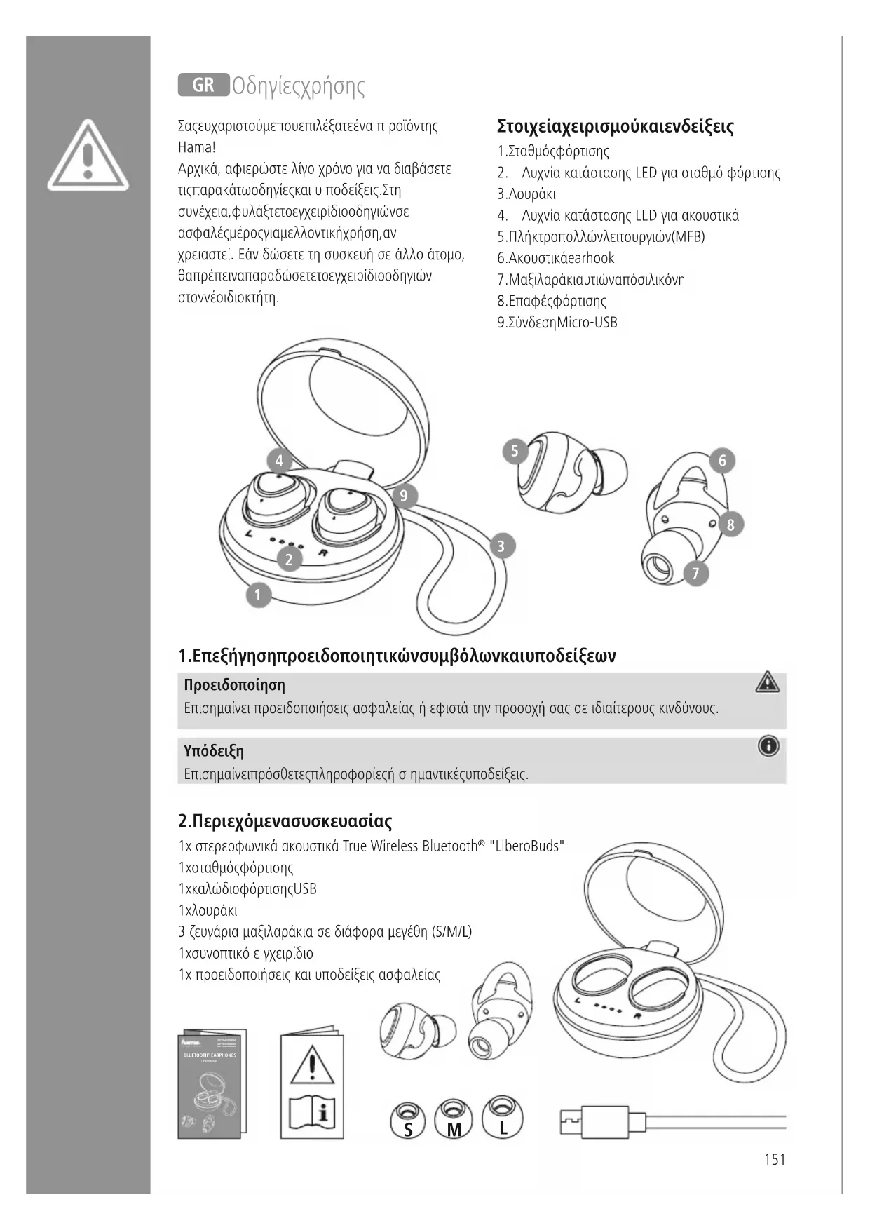 Снастоящото Hama GmbH &CoKGдекларира, че типътнарадиооборудването [00177064, 00177065, 00177066, 00184064, 00184065, 00184066] съответства на Директива 2014/53/ЕС Пълният текст на ЕС декларациятазасъответствие ена разположение на следния Интернет адрес: wwwhamacom->00177064, 00177065, 00177066, 00184064, 00184065, 00184066-> Downloads Честотна лента/честотни ленти 2402MHz –2480 MHz Максимална излъчвателна мощност 5,32mW EIRP151 J Οδηγίες χρήσης Σας ευχαριστούμε που επιλέξατε έναπροϊόν της Hama! Αρχικά, αφιερώστε λίγο χρόνογια να διαβάσετε τις παρακάτω οδηγίες καιυποδείξεις Στη συνέχεια, φυλάξτε το εγχειρίδιο οδηγιών σε ασφαλές μέρος για μελλοντική χρήση, αν χρειαστεί Εάν δώσετε τη συσκευή σε άλλοάτομο, θα πρέπει να παραδώσετε το εγχειρίδιο οδηγιών στον νέο ιδιοκτήτη Στοιχεία χειρισμού και ενδείξεις 1 Σταθμός φόρτισης 2 Λυχνία κατάστασης LED για σταθμό φόρτισης 3 Λουράκι 4 Λυχνία κατάστασης LED για ακουστικά 5 Πλήκτρο πολλών λειτουργιών (MFB) 6 Ακουστικά earhook 7 Μαξιλαράκι αυτιών από σιλικόνη 8 Επαφές φόρτισης 9 Σύνδεση Micro-USB