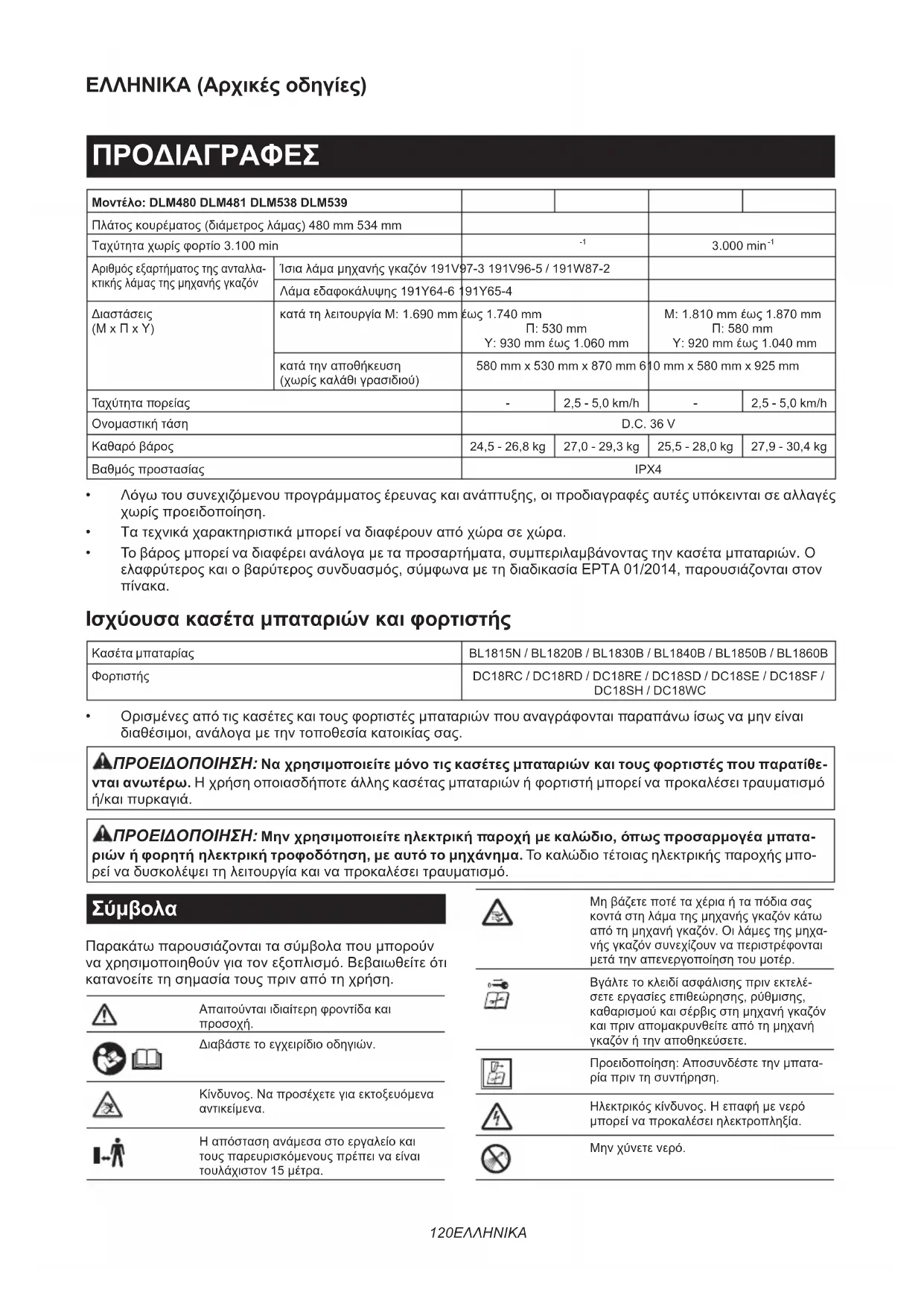(Μ x Π x Υ) κατά τη λειτουργία Μ: 1.690 mm έως 1.740 mm Π: 530 mm Υ: 930 mm έως 1.060 mm Μ: 1.810 mm έως 1.870 mm Π: 580 mm Υ: 920 mm έως 1.040 mm κατά την αποθήκευση (χωρίς καλάθι γρασιδιού) 580 mm x 530 mm x 870 mm 610 mm x 580 mm x 925 mm Ταχύτητα πορείας - 2,5 - 5,0 km/h - 2,5 - 5,0 km/h Ονομαστική τάση D.C. 36 V Καθαρό βάρος 24,5 - 26,8 kg 27,0 - 29,3 kg 25,5 - 28,0 kg 27,9 - 30,4 kg Βαθμός προστασίας IPX4