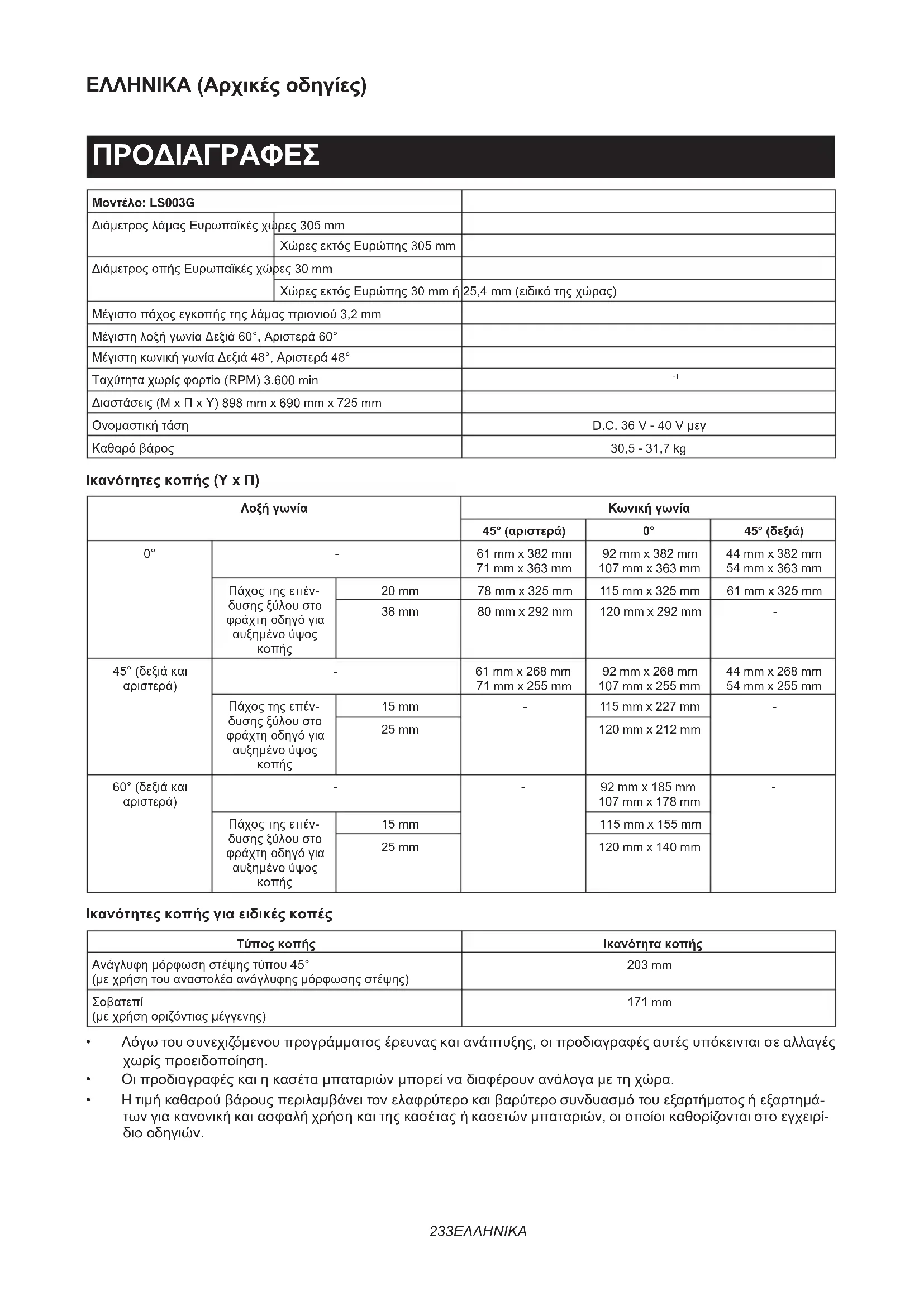 - Original Makita-akku og oplader BEMÆRK: Nogle ting på denne liste kan være inklu- deret i værktøjspakken som standardtilbehør. Det kan være forskellige fra land til land.233 ΕΛΛΗΝΙΚΑ ΕΛΛΗΝΙΚΑ (Αρχικές οδηγίες) ΠΡΟΔΙΑΓΡΑΦΕΣ Μοντέλο: LS003G Διάμετρος λάμας Ευρωπαϊκές χώρες 305 mm Χώρες εκτός Ευρώπης 305 mm Διάμετρος οπής Ευρωπαϊκές χώρες 30 mm Χώρες εκτός Ευρώπης 30 mm ή 25,4 mm (ειδικό της χώρας) Μέγιστο πάχος εγκοπής της λάμας πριονιού 3,2 mm Μέγιστη λοξή γωνία Δεξιά 60°, Αριστερά 60° Μέγιστη κωνική γωνία Δεξιά 48°, Αριστερά 48° Ταχύτητα χωρίς φορτίο (RPM) 3.600 min