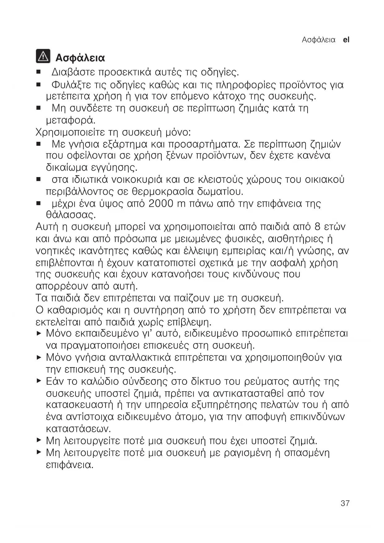 Αυτή η συσκευή μπορεί να χρησιμοποιείται από παιδιά από 8 ετών και άνω και από πρόσωπα με μειωμένες φυσικές, αισθητήριες ή νοητικές ικανότητες καθώς και έλλειψη εμπειρίας και/ή γνώσης, αν επιβλέπονται ή έχουν κατατοπιστεί σχετικά με την ασφαλή χρήση της συσκευής και έχουν κατανοήσει τους κινδύνους που απορρέουν από αυτή. Τα παιδιά δεν επιτρέπεται να παίζουν με τη συσκευή. Ο καθαρισμός και η συντήρηση από το χρήστη δεν επιτρέπεται να εκτελείται από παιδιά χωρίς επίβλεψη.