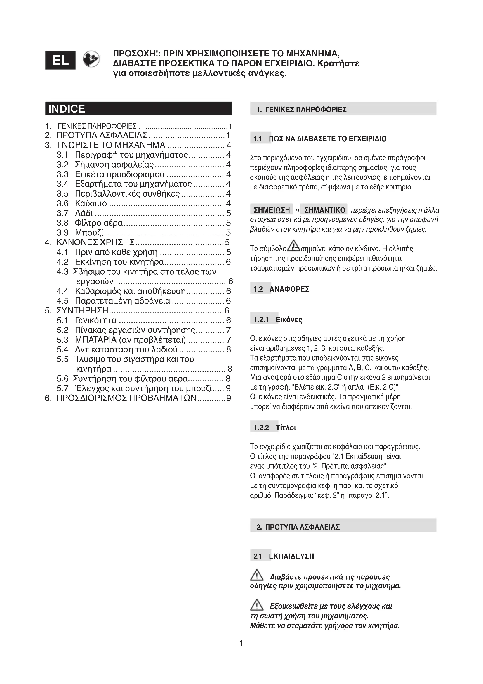 Διαβάστε προσεκτικά τις παρούσες οδηγίες πριν χρησιμοποιήσετε το μηχάνημα. Εξοικειωθείτε με τους ελέγχους και τη σωστή χρήση του μηχανήματος. Μάθετε να σταματάτε γρήγορα τον κινητήρα. ΠΡΟΣΟΧΗ!: ΠΡΙΝ ΧΡΗΣΙΜΟΠΟΙΗΣΕΤΕ ΤΟ ΜΗΧΑΝΗΜΑ, ΔΙΑΒΑΣΤΕ ΠΡΟΣΕΚΤΙΚΑ ΤΟ ΠΑΡΟΝ ΕΓΧΕΙΡΙΔΙΟ. Κρατήστε για οποιεσδήποτε μελλοντικές ανάγκες.