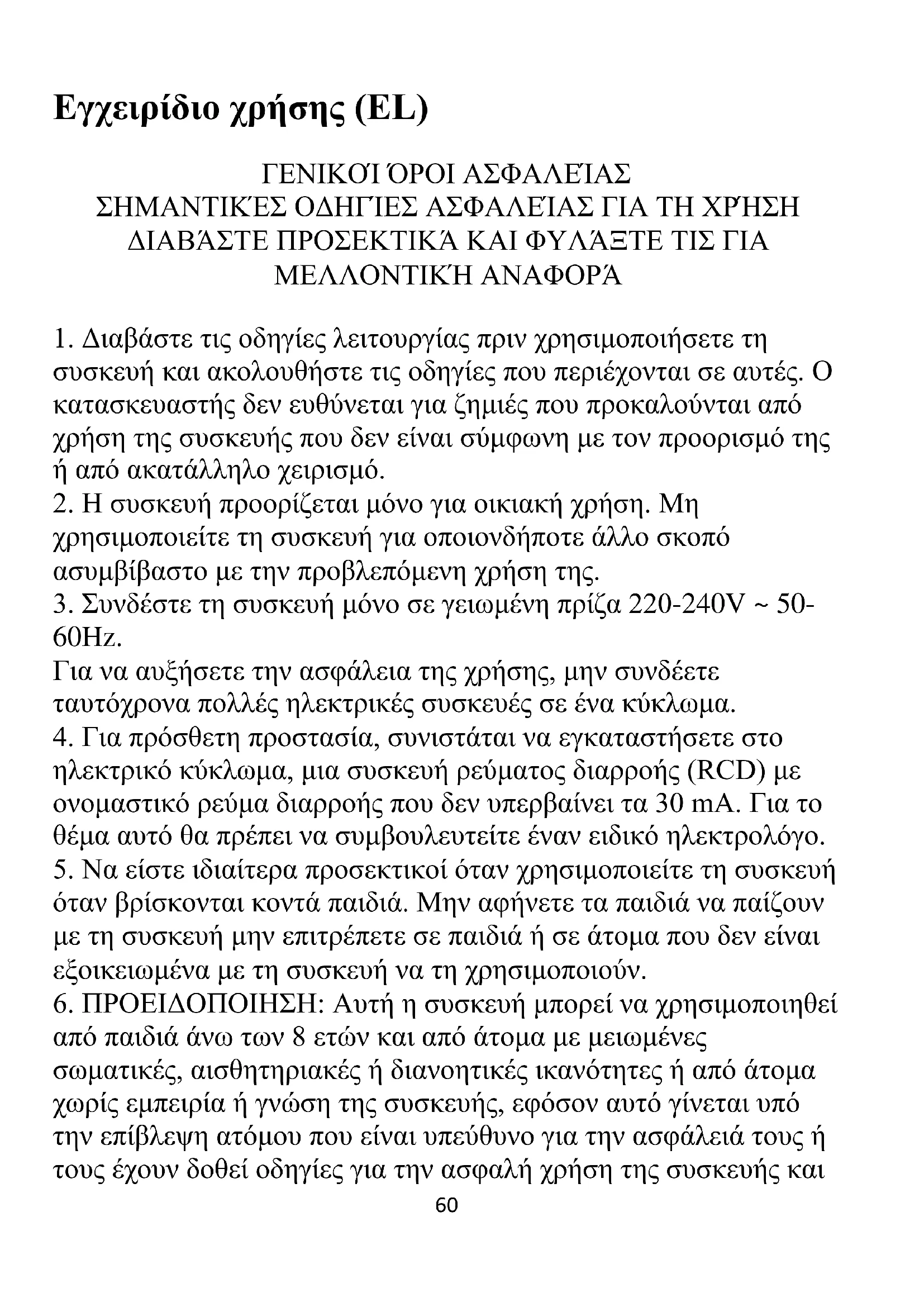 60Hz. Για να αυξήσετε την ασφάλεια της χρήσης, μην συνδέετε ταυτόχρονα πολλές ηλεκτρικές συσκευές σε ένα κύκλωμα.