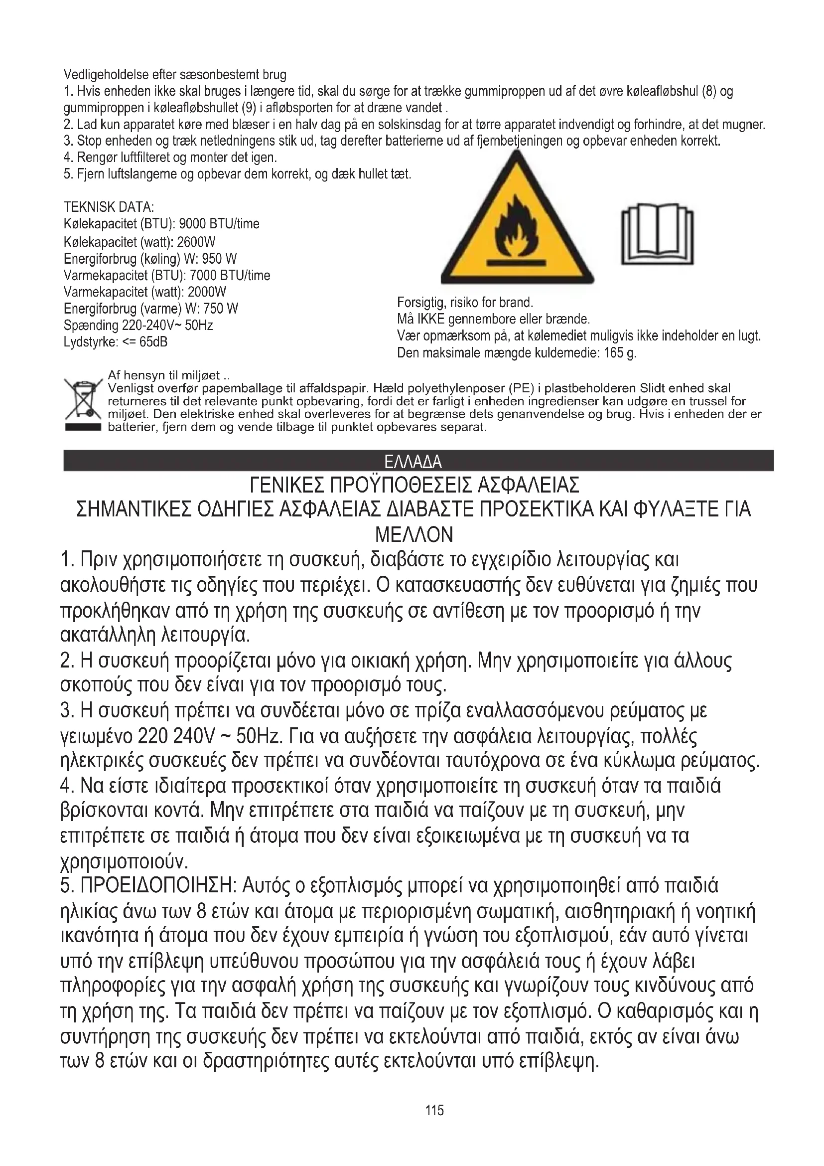 5.Η μονάδα λειτουργεί πιο αποτελεσματικά σε συγκεκριμένες τοποθεσίες δωματίου, επιλέξτε την καλύτερη θέση: - Δίπλα σε ένα παράθυρο, μια πόρτα ή ένα γαλλικό παράθυρο. - Διατηρήστε την απαιτούμενη απόσταση από την έξοδο αέρα επιστροφής στον τοίχο ή άλλα εμπόδια τουλάχιστον 60 cm. - Επεκτείνετε τον εύκαμπτο σωλήνα αέρα για να βεβαιωθείτε ότι το άλλο άκρο του σωλήνα αέρα έχει διάκενο μεταξύ της πόρτας του παραθύρου ή του παραθύρου γαλλικού τύπου ή της οπής τοίχου. - Η έξοδος ή η εισαγωγή αέρα δεν μπορεί να μπλοκαριστεί από προστατευτικό πλέγμα ή οποιοδήποτε εμπόδιο. Για να παρατείνετε τη διάρκεια ζωής της μονάδας, αποστραγγίστε το συμπυκνωμένο νερό από την επάνω (8) και την κάτω (9) οπή αποστράγγισης του ψυγείου πριν βάλετε τη μονάδα σε αποθήκευση στο τέλος της σεζόν. ΠΕΡΙΓΡΑΦΗ ΣΥΣΚΕΥΗΣ (εικόνες Α και Β)