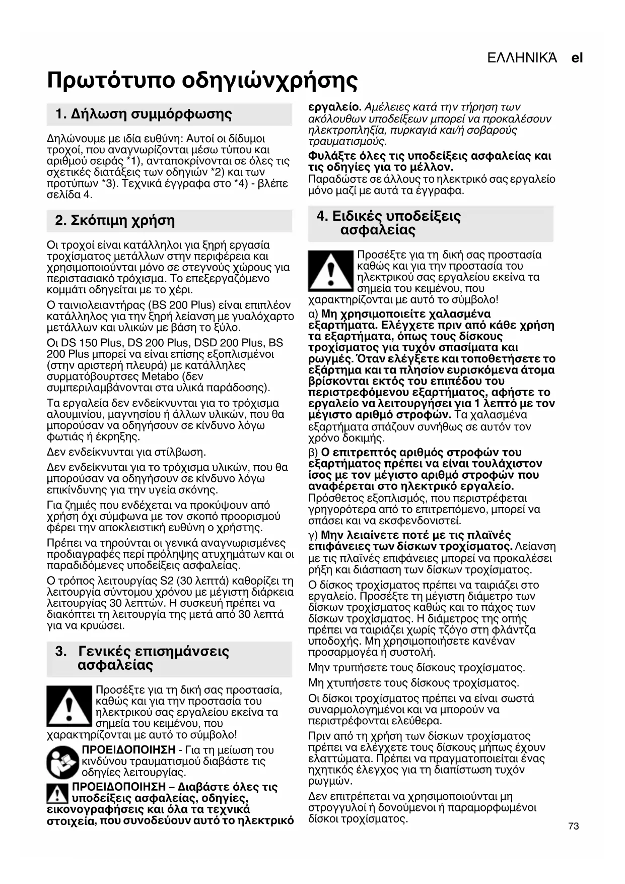 Πρωτότυπο οδηγιώνχρήσης Δηλώνουμε με ιδία ευθύνη: Αυτοί οι δίδυμοι τροχοί, που αναγνωρίζονται μέσω τύπου και αριθμού σειράς *1), ανταποκρίνονται σε όλες τις σχετικές διατάξεις των οδηγιών *2) και των προτύπων *3). Τεχνικά έγγραφα στο *4) - βλέπε σελίδα 4. Οι τροχοί είναι κατάλληλοι για ξηρή εργασία τροχίσματος μετάλλων στην περιφέρεια και χρησιμοποιούνται μόνο σε στεγνούς χώρους για περιστασιακό τρόχισμα . Το επεξεργαζόμενο κομμάτι οδηγείται με το χέρι. Ο ταινιολειαντήρας (BS 200 Plus) είναι επιπλέον κατάλληλος για την ξηρή λείανση με γυαλόχαρτο μετάλλων και υλικών με βάση το ξύλο. Οι DS 150 Plus, DS 200 Plus, DSD 200 Plus, BS 200 Plus μπορεί να είναι επίσης εξοπλισμένοι (στην αριστερή πλευρά) με κατάλληλες συρματόβουρτσες Metabo (δεν συμπεριλαμβάνονται στα υλικά παράδοσης). Τα εργαλεία δεν ενδείκνυνται για το τρόχισμα αλουμινίου, μαγνησίου ή άλλων υλικών, που θα μπορούσαν να οδηγήσουν σε κίνδυνο λόγω φωτιάς ή έκρηξης. Δεν ενδείκνυνται για στίλβωση. Δεν ενδείκνυται για το τρόχισμα υλικών, που θα μπορούσαν να οδηγήσουν σε κίνδυνο λόγω επικίνδυνης για την υγεία σκόνης. Για ζημιές που ενδέχεται να προκύψουν από χρήση όχι σύμφωνα με τον σκοπό προορισμού φέρει την αποκλειστική ευθύνη ο χρήστης. Πρέπει να τηρούνται οι γενικά αναγνωρισμένες προδιαγραφές περί πρόληψης ατυχημάτων και οι παραδιδόμενες υποδείξεις ασφαλείας. Ο τρόπος λειτουργίας S2 (30 λεπτά) καθορίζει τη λειτουργία σύντομου χρόνου με μέγιστη διάρκεια λειτουργίας 30 λεπτών. Η συσκευή πρέπει να διακόπτει τη λειτουργία της μετά από 30 λεπτά