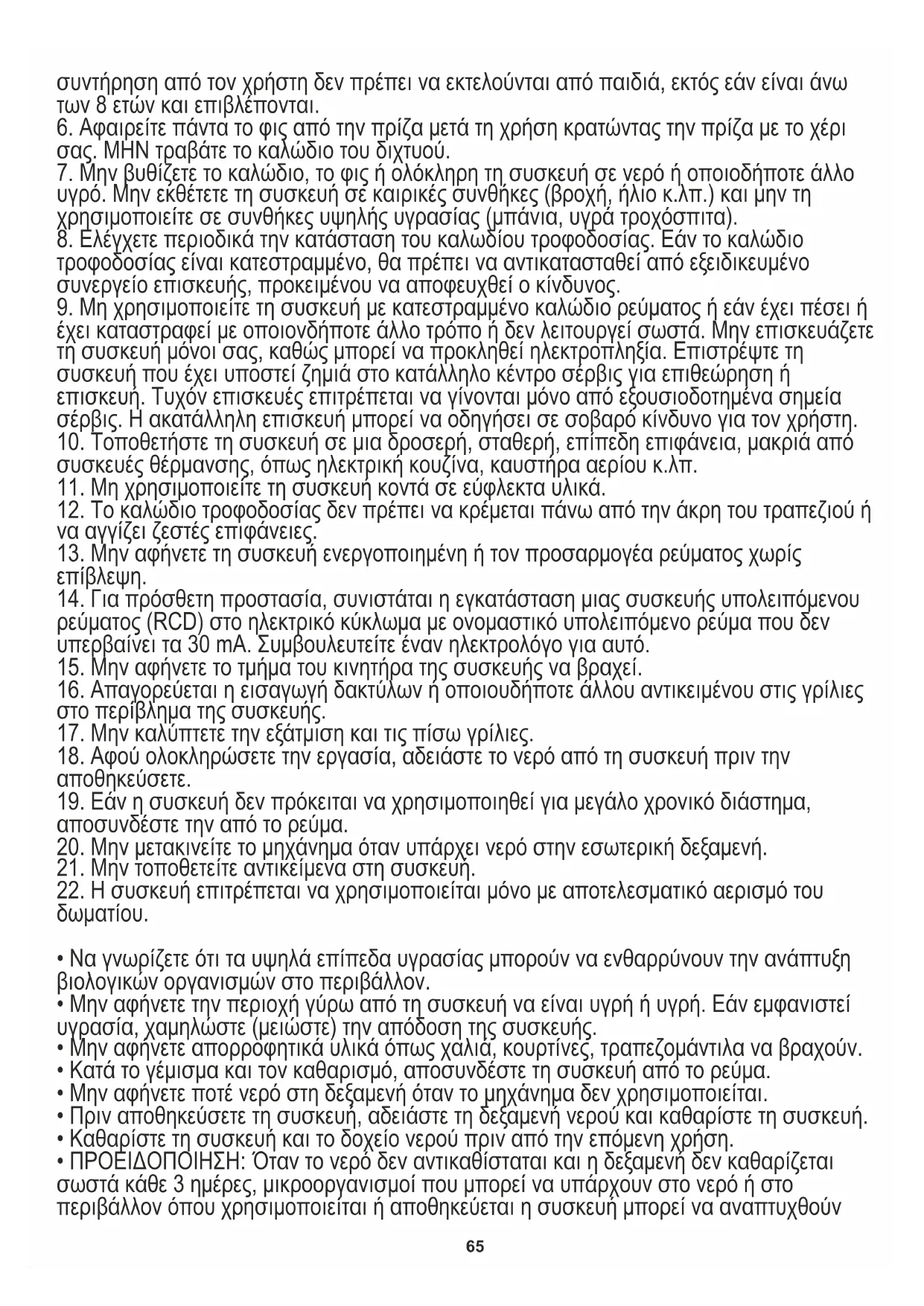 των 8 ετών και άτομα με μειωμένες σωματικές, αισθητηριακές ή νοητικές ικανότητες ή άτομα χωρίς εμπειρία ή γνώση του εξοπλισμού, εάν πραγματοποιείται υπό την επίβλεψη ατόμου που είναι υπεύθυνο για την ασφάλειά τους ή τους έχουν δοθεί οδηγίες για την ασφαλή χρήση της συσκευής και έχουν επίγνωση των κινδύνων που συνδέονται με τη χρήση της. Τα παιδιά δεν πρέπει να παίζουν με τον εξοπλισμό. Ο καθαρισμός και η65 συντήρηση από τον χρήστη δεν πρέπει να εκτελούνται από παιδιά, εκτός εάν είναι άνω των 8 ετών και επιβλέπονται.
